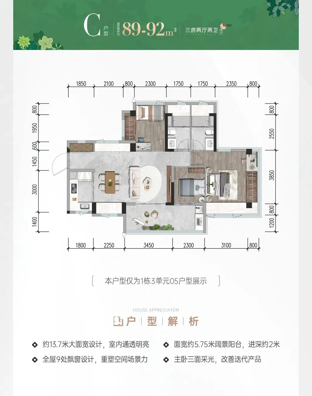 89-92㎡的3房2厅2卫,C户型,设计的是横厅南北通透格局,进门入户玄关,客餐厅5.7米开间,LDKB一体化设计,主卧套房双飘窗,分别做到了主卧18.5㎡/次卧7.7㎡/次卧6.9㎡(包含墙体飘窗),客厅连接次卧出11.5㎡的巨幕大阳台,U型厨房,科学双明卫,得房率约78.9%(不含赠送),阳台主朝东南向。套内面积71.4㎡+赠送面积22.8㎡=实得94.2㎡,加上赠送后得房率约105.22%。