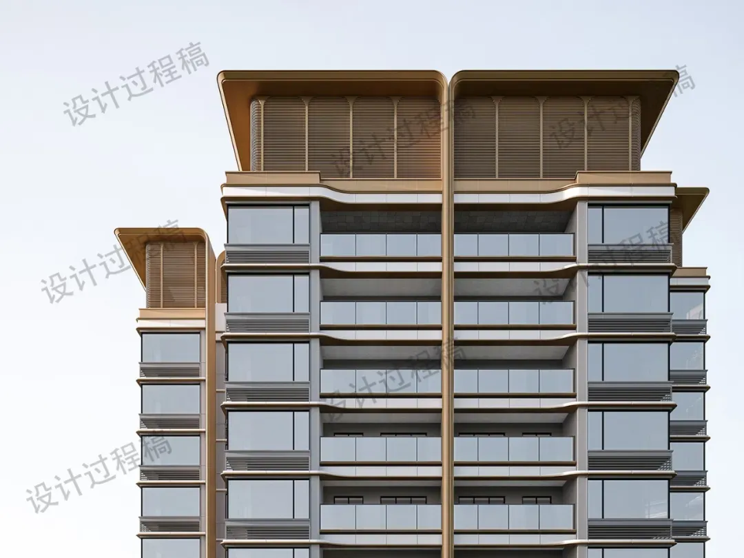 据说招商会展湾雍境名邸的项目外立面,光是铝板+玻璃的占比就约70%,还采用了栅格、石板等材料为装饰,外观极简大气,造价高昂。