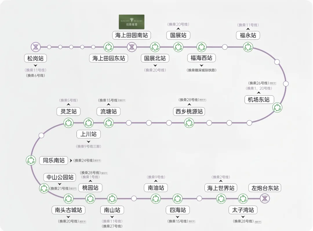 交通配套:招商会展湾雍境名邸交通配套极为便捷,形成"五维立体交通"网络。轨道交通方面,项目紧邻地铁12号线海上田园南站A出口,步行约50米可达,1站可到国展北站换乘20号线(机场快线),5站到福永站换乘11号线,快速通达南山中心、太子湾、宝安中心、科技园、福田CBD等区域。20号线二期(白石洲-机场北)计划2028年通车,未来将进一步提升区域交通效率。
