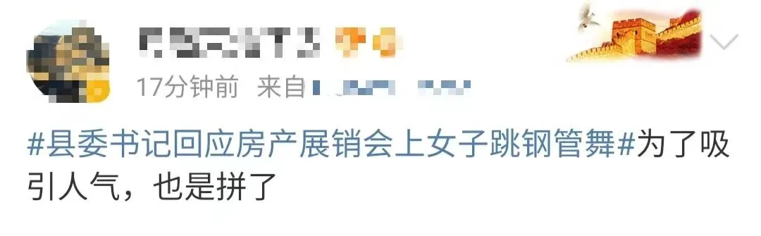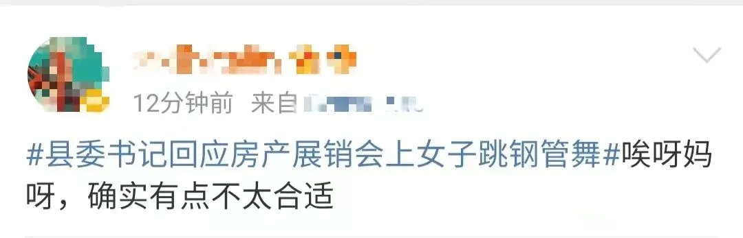 对于房产展销会上的钢管舞表演及相关回应,网友们发表了自己不同的观点。一些网友认为“确实有些不太合适”,觉得这类表演“为了吸引人气也是拼了”。