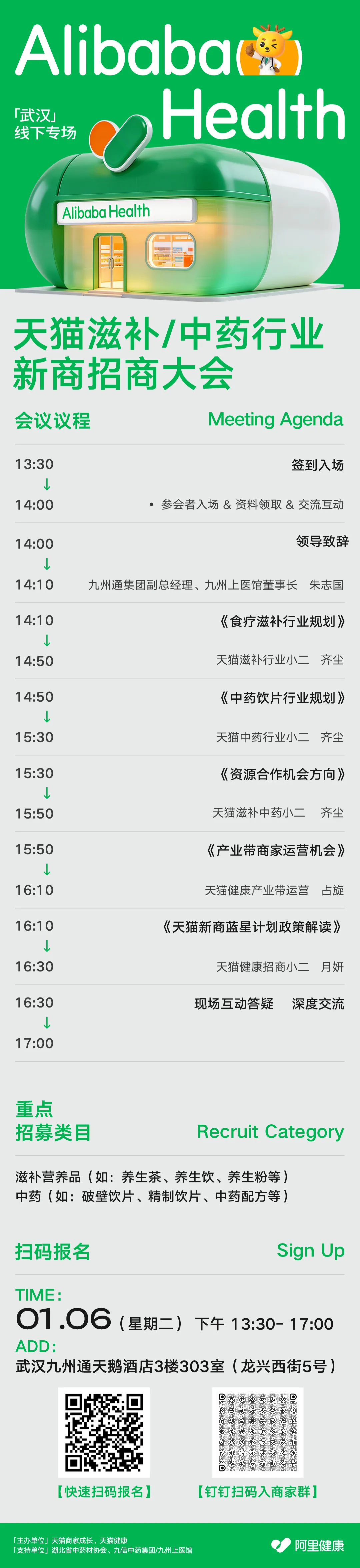 武汉专场将于1月6日(周二)举办,重点招募类目覆盖:滋补营养品(养生茶、养生饮、养生粉等)与中药(破壁饮片、精制饮片、中药配方等),欢迎以上类目的商家扫描下面图片二维码报名,并加入商家群获取会议信息与参会答疑。