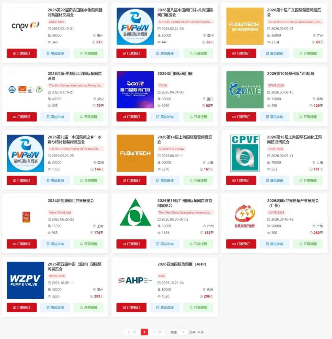 关注【展会一网通】微信公众号,在聊天对话框内点击底部菜单栏【泵阀】查看全国泵阀展最新展会信息、门票预约入口