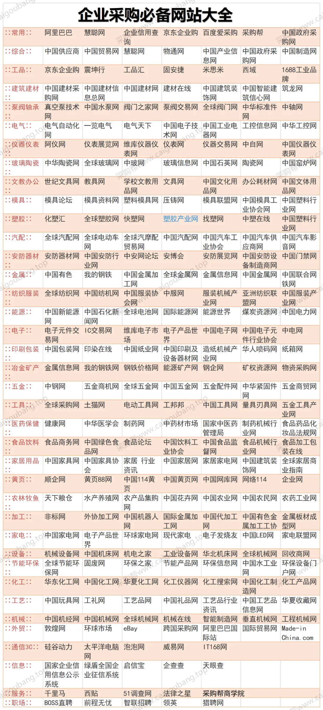采购网站已发展为一种战略角色,主要意义在于能以正确的价格获得正确的功能,而传统意义上讲,是降低成本和提高公司利润率。以下是采购帮为广大采购伙伴分类整理的采购网址大全,仅供参考,欢迎补充。