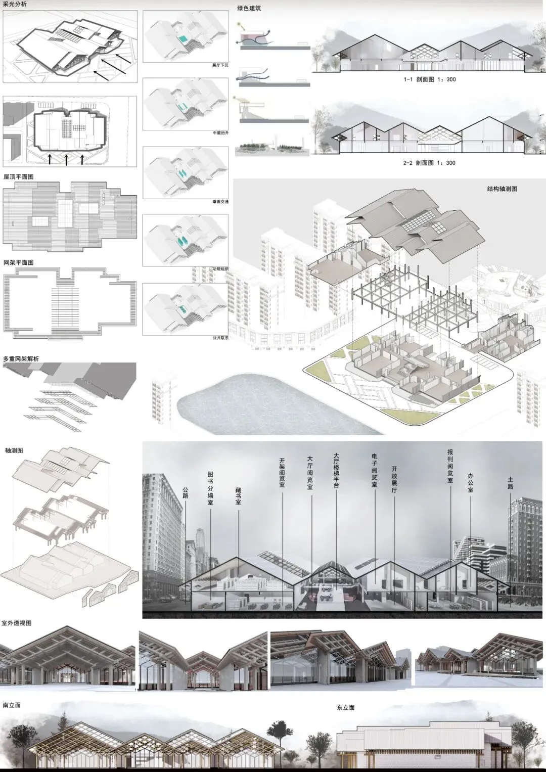 在当今光怪陆离的城市里,熙熙攘攘,充斥着发展和工业的气味。找一个有大自然氛围的场所读本书是一种极为奢求的享受。本建筑的大屋顶之下以菱形穿插的网架系统,以森林中交织的树冠为意象,将林间的树冠群像抽象为富有张力的建筑结构,成为本案最有表现力的形象特征。让读者感受到大自然的氛围,尽情享受工作之余的闲暇时光。