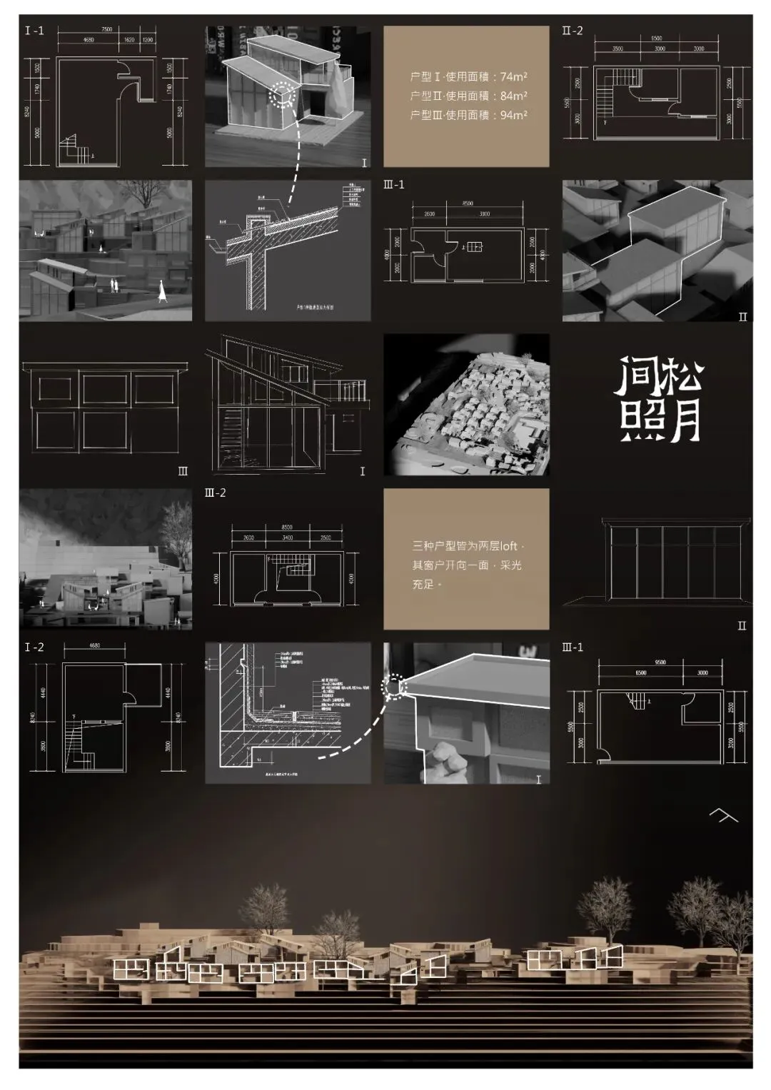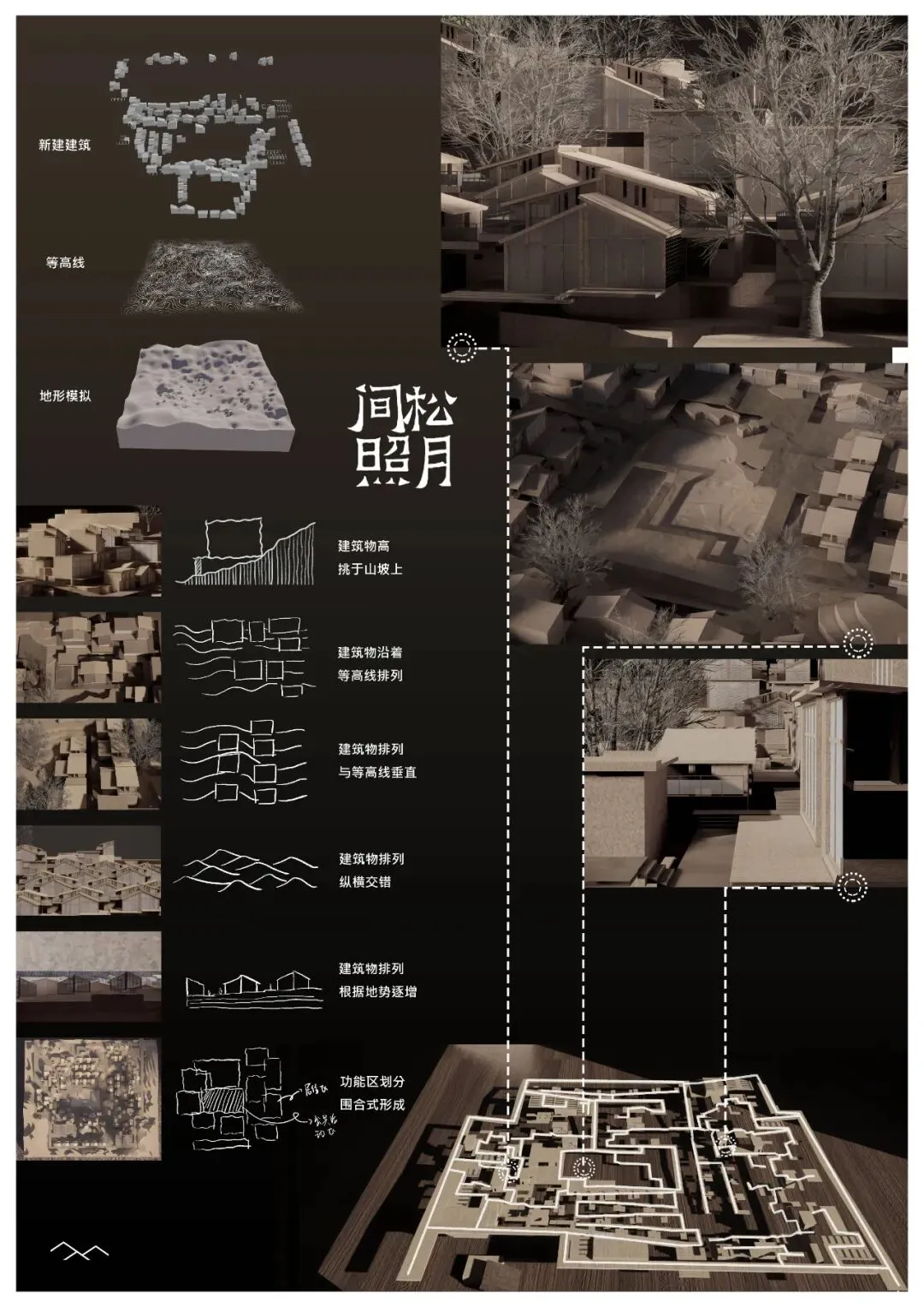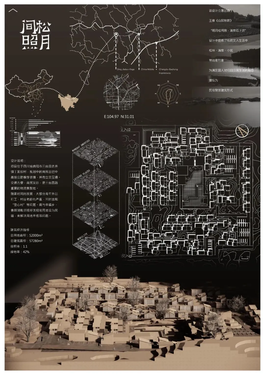 该集合住宅设计立意出自于王维《山居秋暝》中的“明月松间照,清泉石上流”,设计中提炼了传统文人生活中松林、清泉、小筑等诗意形象,为满足国人对归园田居生活的期愿,遂拟为民宿聚落建筑形式。项目位于四川省绵阳市三台县古井镇丁家坝村,规划中的南部至巴中高速公路横穿该镇,并有立交互通,交通方便,商贸发达,是三台西路重要的物资集散地,随着社会的发展,大部分青年外出打工,村庄老龄化严重,同时出现“空心村”等问题。南与幸福乡、鲁班湖毗邻现将该规划为民宿,以此来解决用地率低的问题。