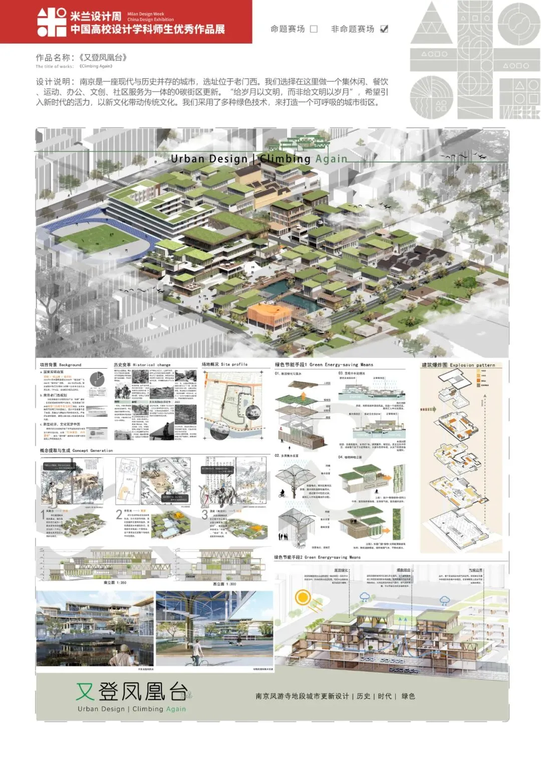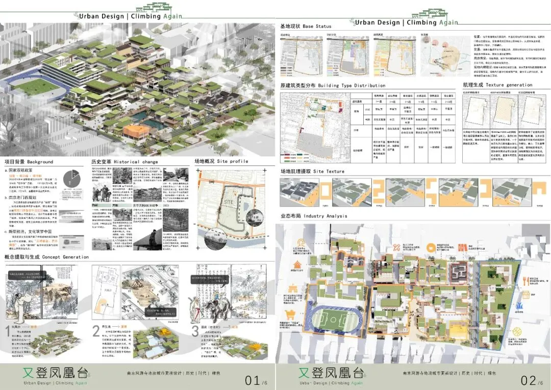 南京是一座现代文明与历史古迹并存的融合城市,存在着许多时代遗留的尴尬地块。选址位于老门西,紧靠愚园,是一处存在许多故事的遗留地块。我们选择在这里做一个集休闲、餐饮、运动、办公、文创、社区服务为一体的0碳综合街区更新。我永远记得那句话:“给岁月以文明,而非给文明以岁月”,我们希望引入新鲜血液,注入新时代的活力,以新文化带动传统文化,做到一个真正的历史街区更新。此外,为迎合“双碳政策”以及国际绿色节能趋势,我们采用了多种绿色技术,来打造一个可呼吸的城市街区,造福于整个地区。