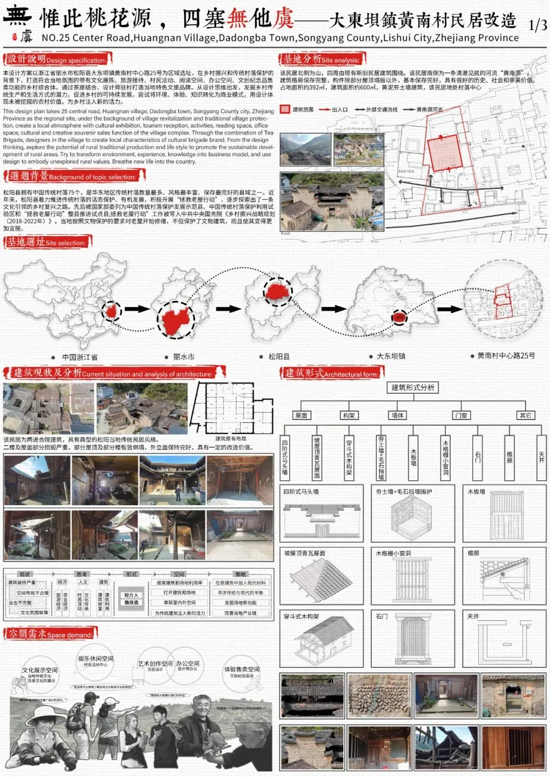 本设计方案以浙江省丽水市松阳县大东坝镇黄南村中心路25号为区域选址,在乡村振兴和传统村落保护的背景下,打造符合当地氛围的带有文化展陈、旅游接待、村民活动、阅读空间、办公空间、文创纪念品售卖功能的乡村综合体。通过茶旅结合、设计师驻村打造当地特色文旅品牌。从设计思维出发,发掘乡村传统生产和生活方式的潜力,促进乡村的可持续发展。尝试将环境、体验、知识转化为商业模式,用设计体现未被挖掘的农村价值。为乡村注入新的活力。