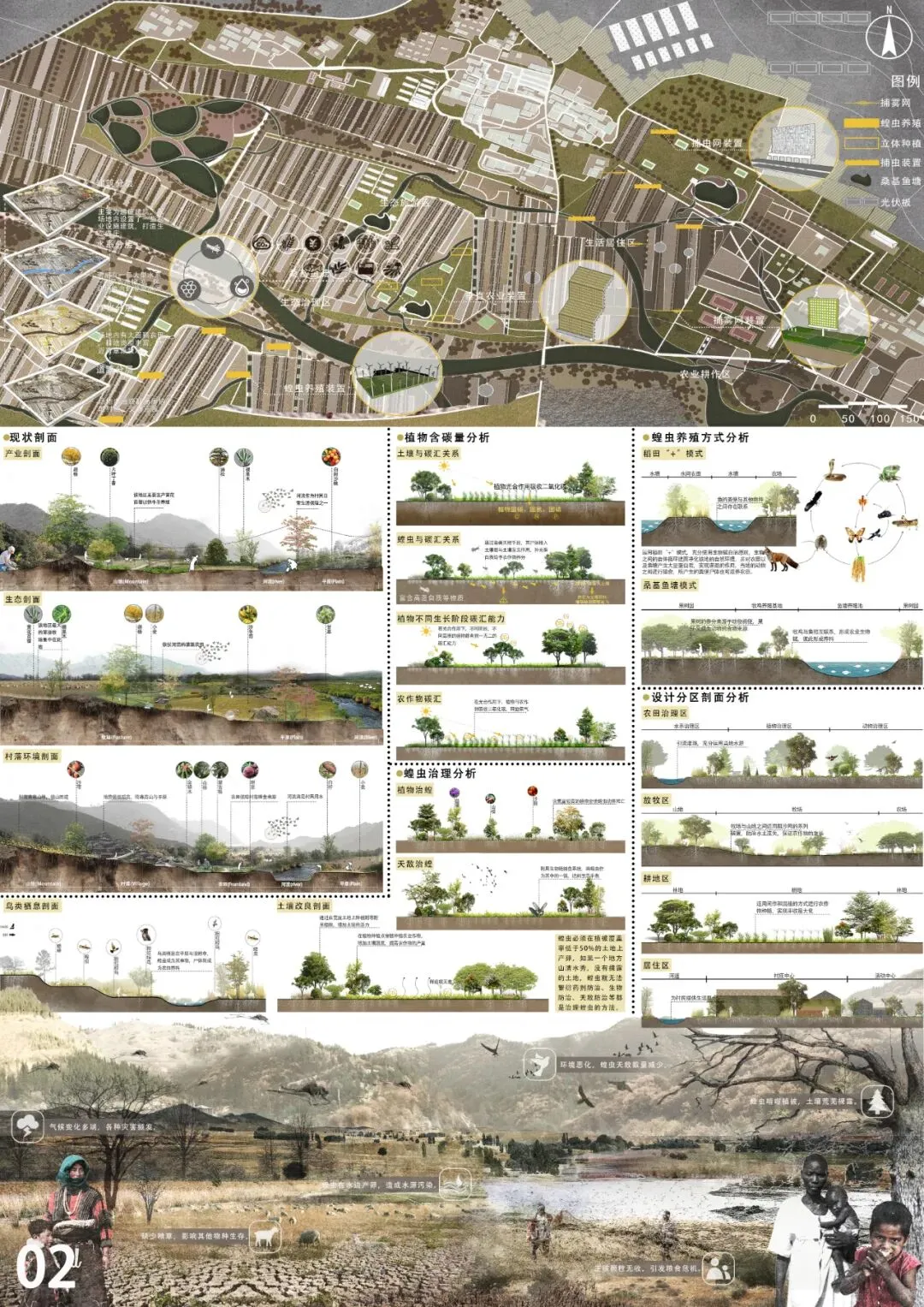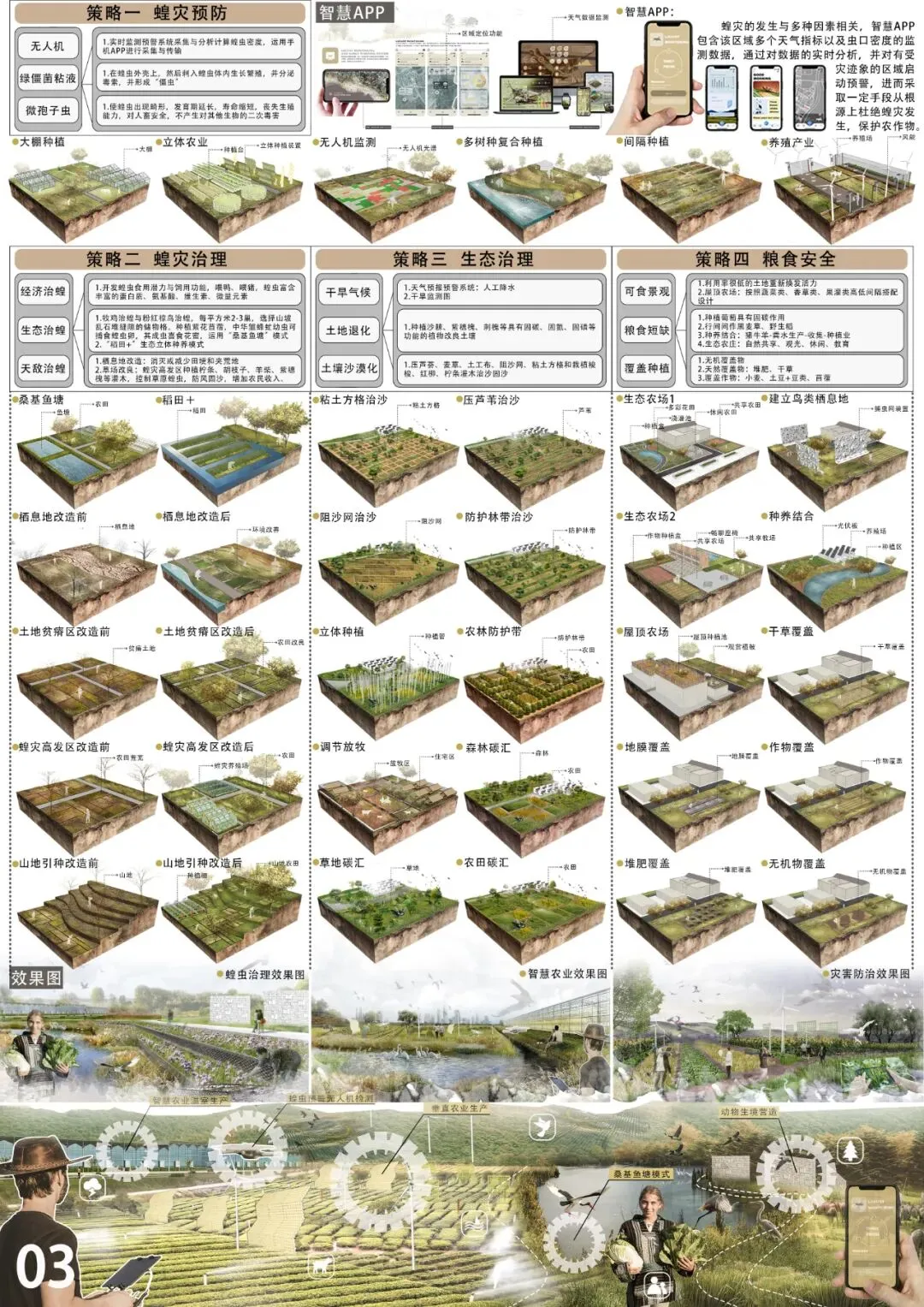 设计场地位于内蒙古自治区赤峰市阿鲁科尔沁旗蝗灾高发地段,该地区是陆地生态系统的重要一环,也是构成农田碳汇的关键组成部分。阿鲁科尔沁旗因气候变化多端及人类活动等因素影响,常年受蝗灾侵袭,当地大面积的农田被毁坏,严重损害了当地的农田生态系统。本次设计的景观体系主要针对三个问题对应不同的策略方式。针对自然灾害问题,放置“捕雾网装置”,收集场地雾水,使场地季节性降雨不均衡所导致的旱季缺水问题得到缓解。针对蝗虫危害问题:从治理以及预防角度出发,投放“捕虫网”及“蝗虫养殖装置”同时设立蝗虫检测系统解决蝗虫灾害问题。