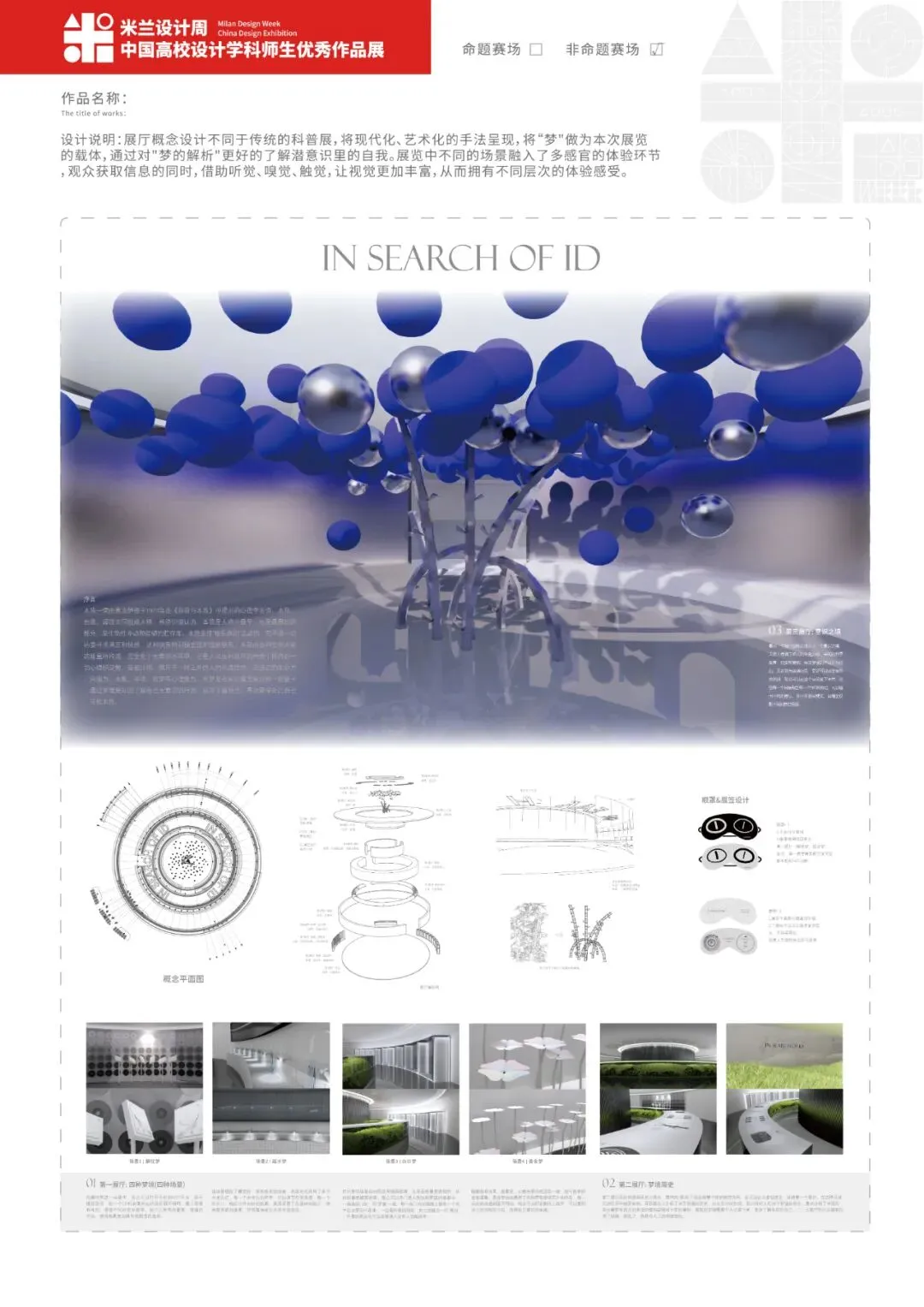 寻找本我-展厅概念设计不同于传统的科普展,将现代化、艺术化的手法呈现。展览中不同的场景融入了多感官的体验环节,观众获取信息的同时,借助听觉、嗅觉、触觉,让视觉更加丰富,从而拥有不同层次的体验感受。在第一展厅【解忧梦】这一场景中,观众可以打开手机的NFC开关,即可播放音乐,每一个CD机装置对应的音乐都不相同,戴上眼罩和耳机,感受不同的音乐旋律。设计上采用的重复、戏谑的手法,使得场景更加具有戏剧性的色彩。