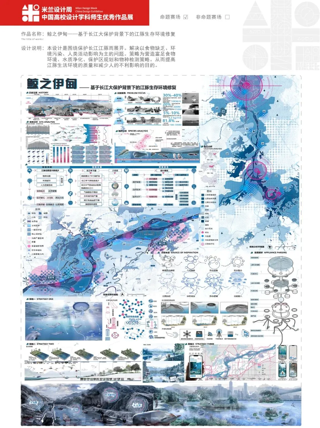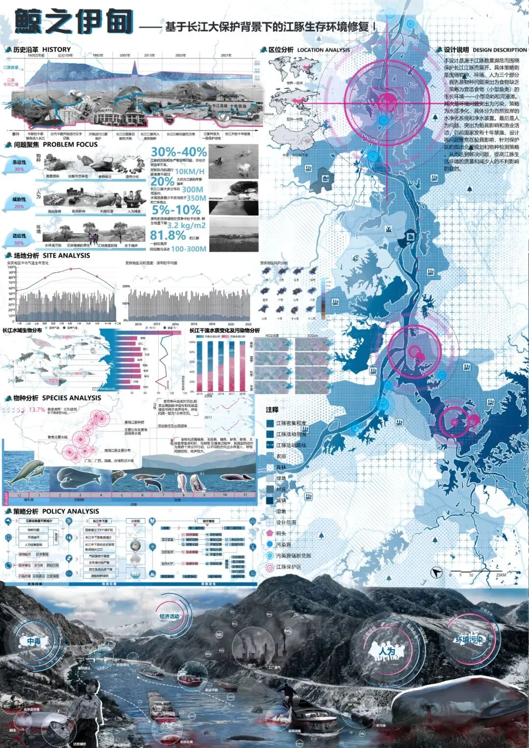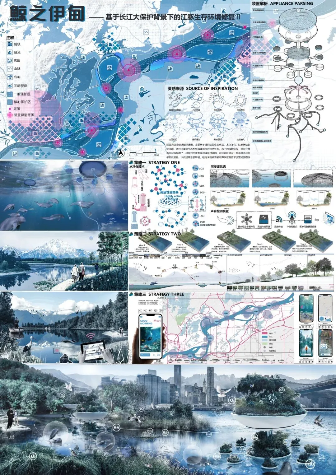 本设计是源于江豚数量濒危而围绕保护长江江豚而展开。具体策略则是围绕物种、环境、人为三个部分,首先是物种问题突出为食物缺乏,策略为营造食物(小型鱼类)的生长环境——小型岛屿和河漫滩。其次是环境问题突出为污染,策略为水质净化,具体分为自然驳岸的水净化系统和净水装置。最后是人为问题,突出为船具影响和渔业活动,目前国家发布十年禁渔,设计将问题聚焦在船具影响,针对保护区的提出合理规划和物种检测策略。从而达到解决问题,提高江豚生活环境的质量和减少人的不利影响的目的。