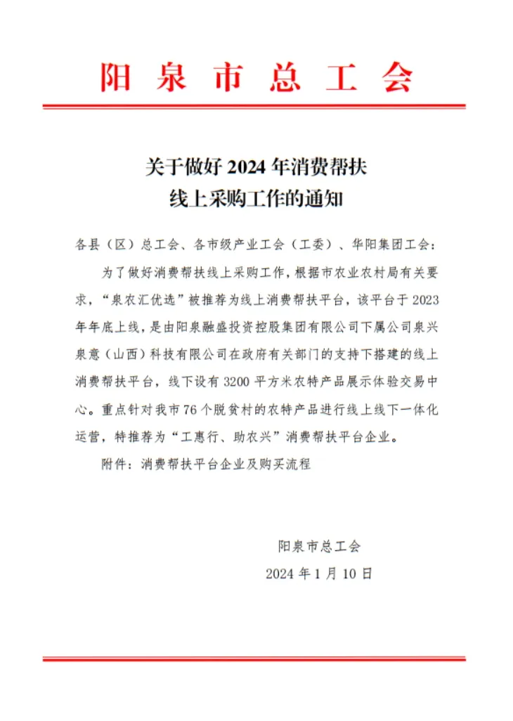 泉农汇优选,是由阳泉融盛投资控股集团有限公司(国有独资企业) 旗下泉兴泉意(山西) 科技有限公司在政府有关部门的支持下搭建的线上消费帮促平台,线下设有3200㎡农特产展示体验交易中心。