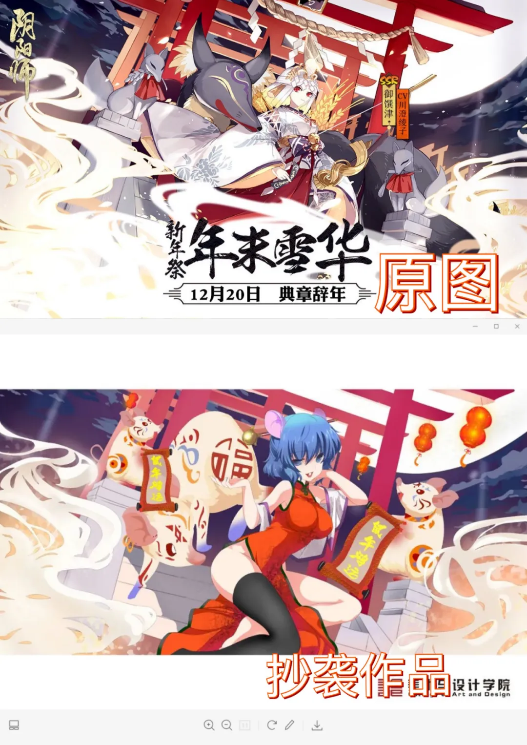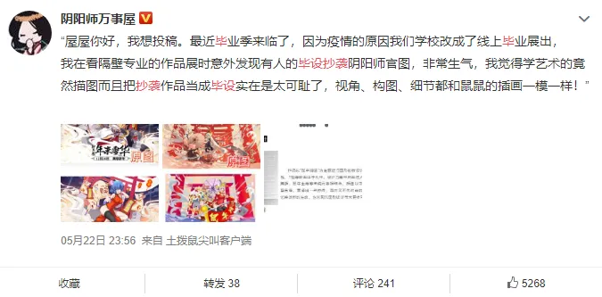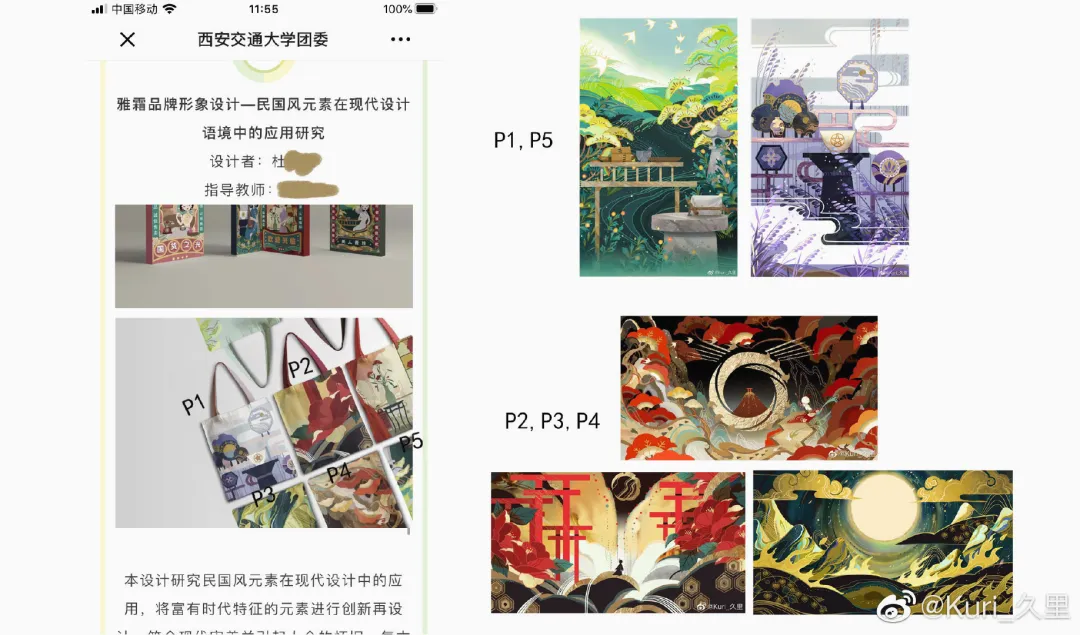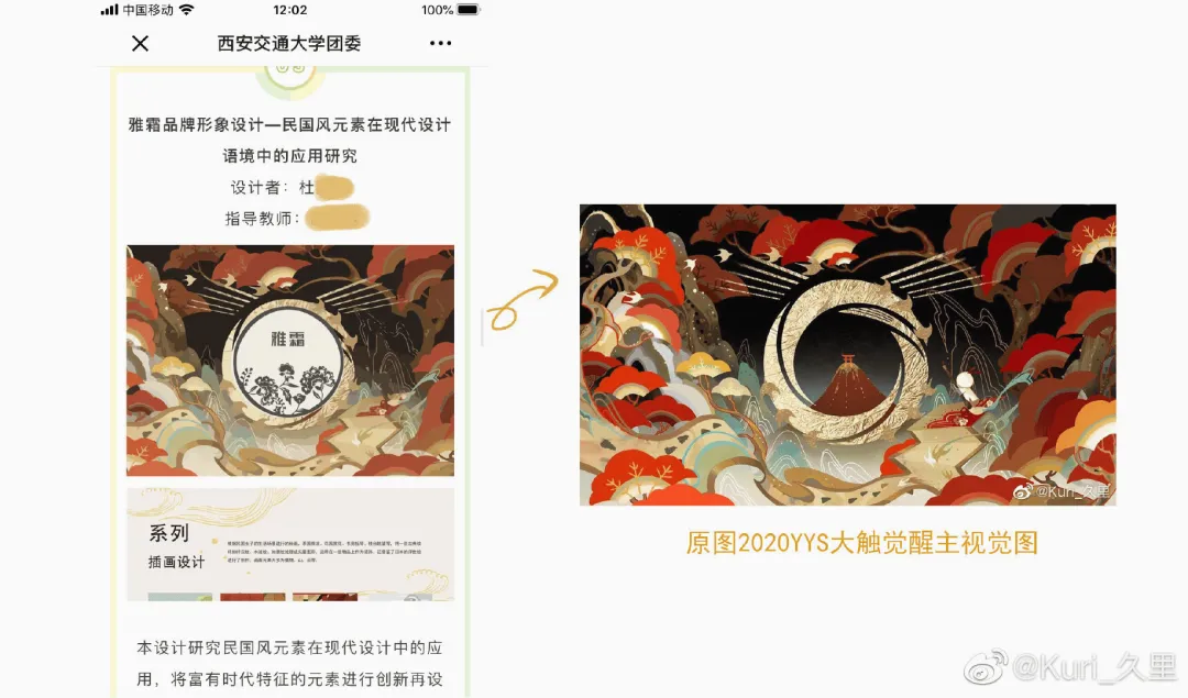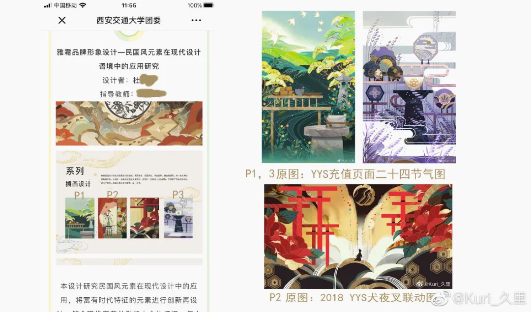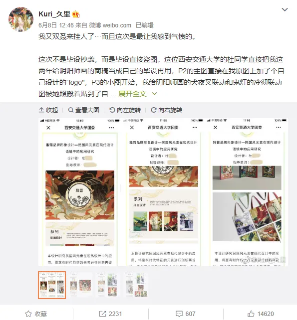 6月8日,自由插画师Kuri_久里在微博上挂出了西安交通大学毕设作品抄袭的信息。久里太太表示,这一组图已经“不算是抄袭,而是直接盗图!”学生把自己给阴阳师画的联动图,直接“原样照搬”贴进了自己的毕设里!