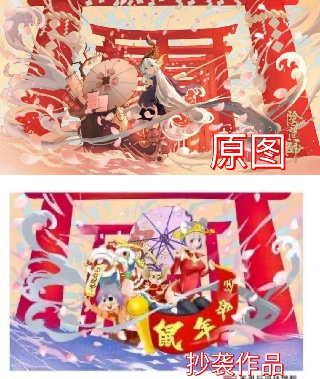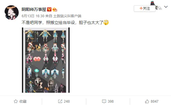 同样是来自阴阳师万事屋的信息,同样还是阴阳师。树大招风不是说说而已,海报也被拿来抄袭。这个倒是不原样照搬,主要把形和构图给抄了,只不过不照搬是不是就画不好画了?这粗制滥造的画风,真正象征了自己的真实水平?