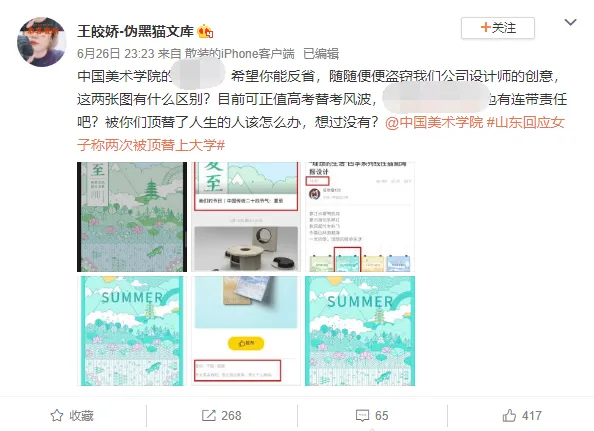 · 06 中国美术学院-设计艺术学院:夏至海报 ·网友王皎娇-伪黑猫文库在个人微博上贴出了自己公司设计师的作品被抄袭的声明。