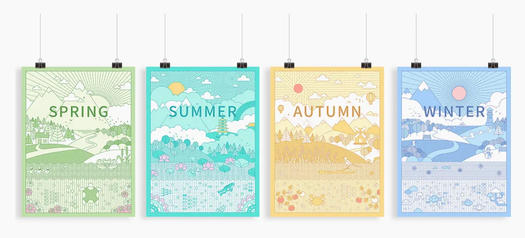 原版海报共有四张,按照春夏秋冬四季分类,主题鲜明。抄袭的海报取了夏天的主题,删去了顶部太阳光线的设计。