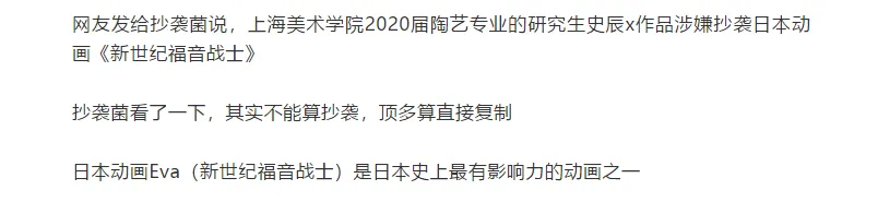 前两天,公众号“抄袭的艺术”(公众号ID:chaoxiart)指出,上海美术学院陶艺专业学生毕设抄袭日本知名动画《新世纪福音战士》。