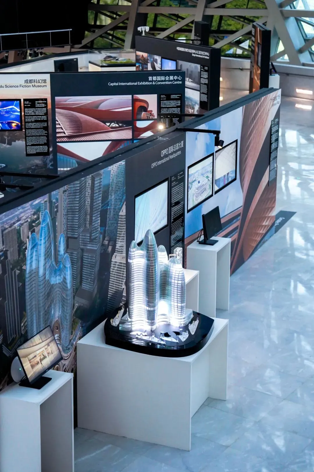 深圳OPPO国际总部(2020,建设中)。图为展览现场展出的建筑模型。