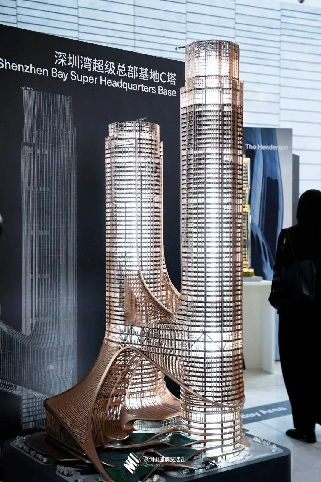 深圳湾超级总部基地C塔(2020,建设中),图为展览现场展出的建筑模型。