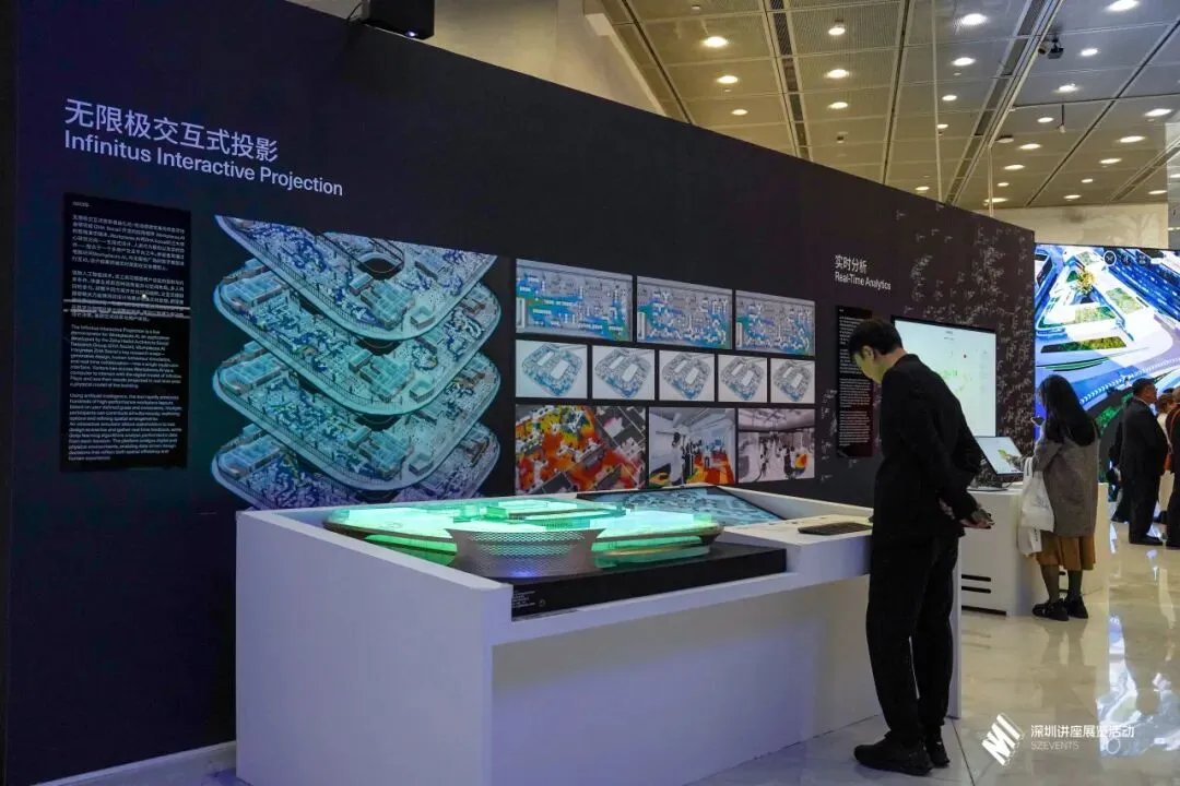 无限极交互式投影则让观众化身建筑共创者:通过与数字模型互动,指尖轻触便能触发AI生成上百种办公布局,而这些设计成果会实时投射在实体模型上,直观呈现空间优化的多种可能。