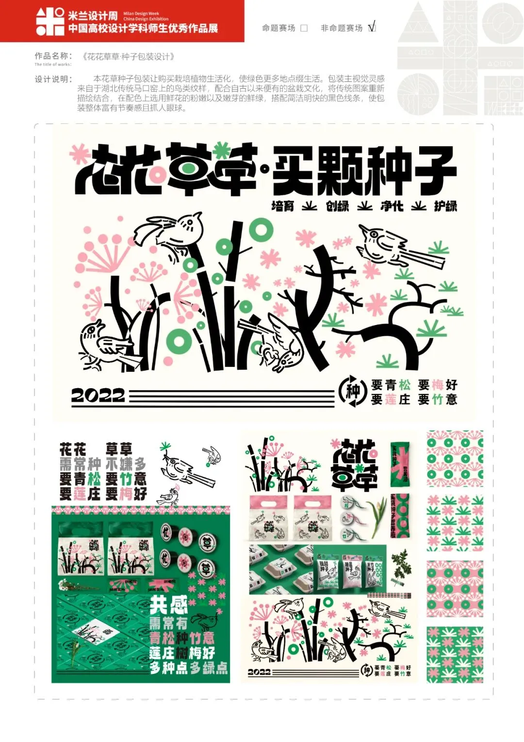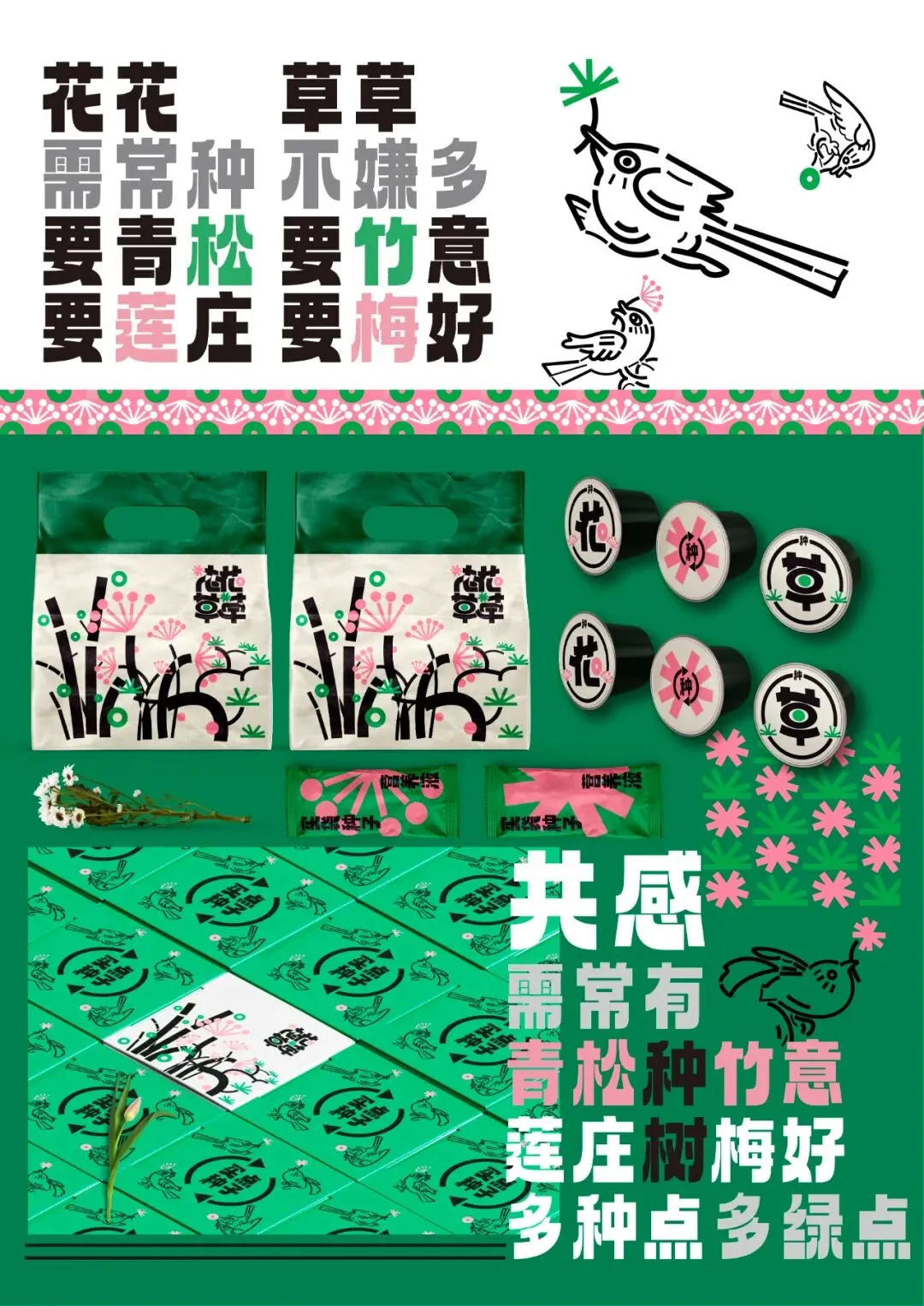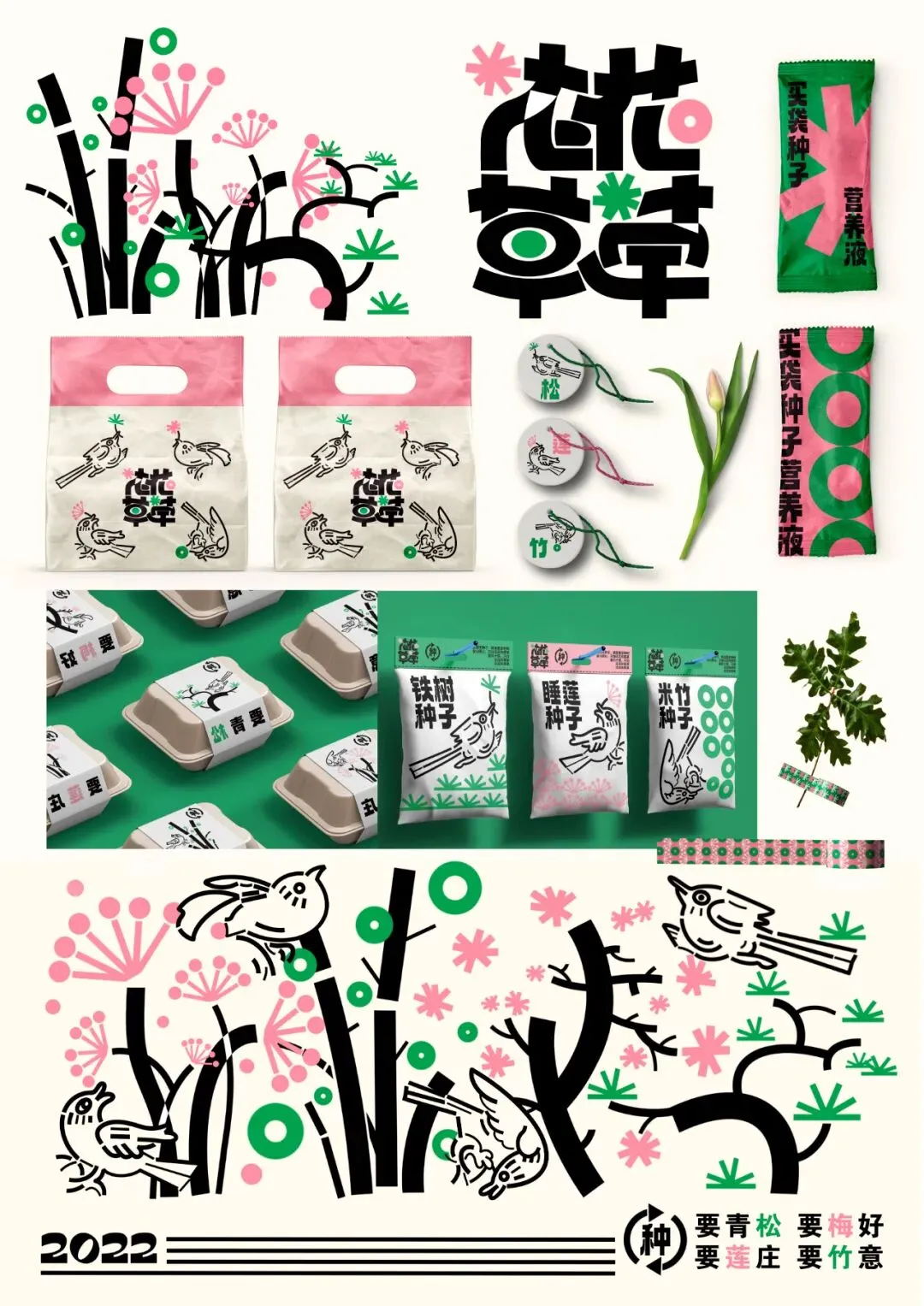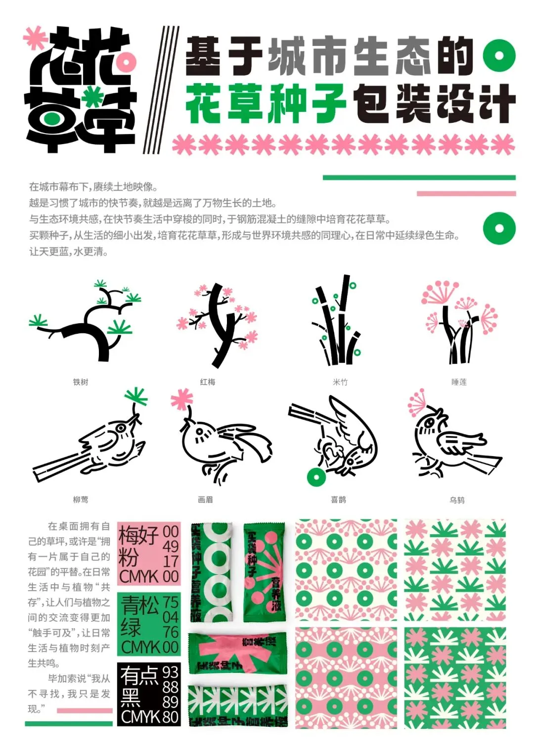 在城市生活的我们,每天都穿梭在钢筋水泥中,很难静下心来接触花花草草。本植物盆栽种子包装旨在让绿意走进生活,让天更蓝、山更绿、水更清。本花草种子包装让购买栽培植物生活化,使绿色更多地点缀生活。包装主视觉灵感来自于湖北传统马口窑上的鸟类纹样,配合自古以来便有的盆栽文化,将传统图案重新描绘结合,使其活泼自在,更符合当代年轻人的审美需求。在配色上选用鲜花的粉嫩以及嫩芽的鲜绿,搭配简洁明快的黑色线条,使包装整体富有节奏感且抓人眼球。