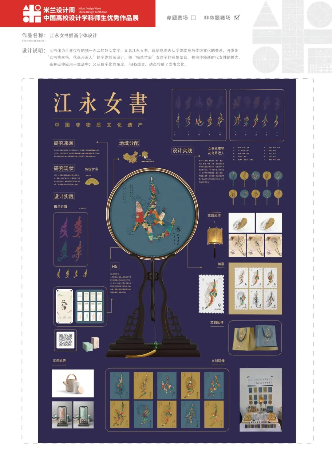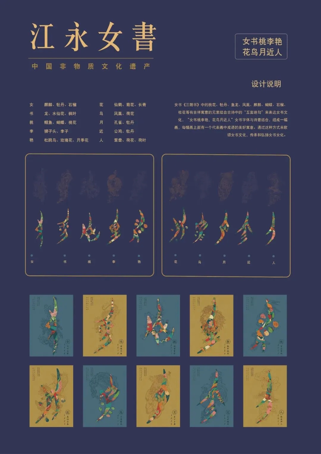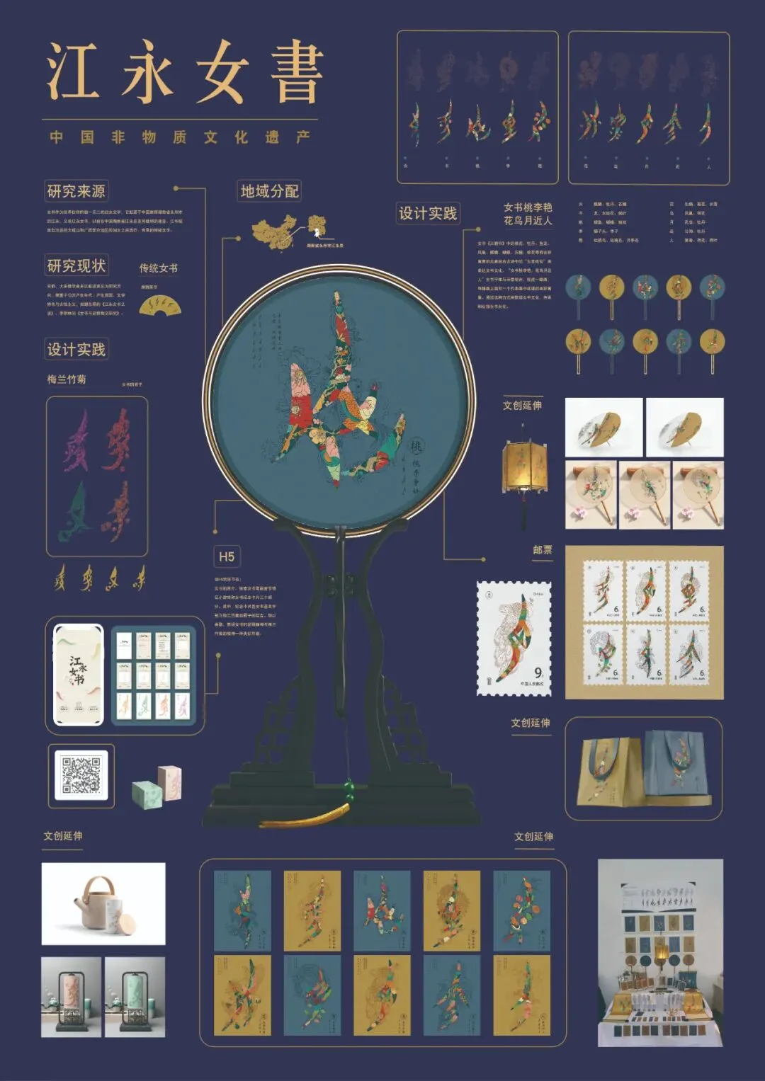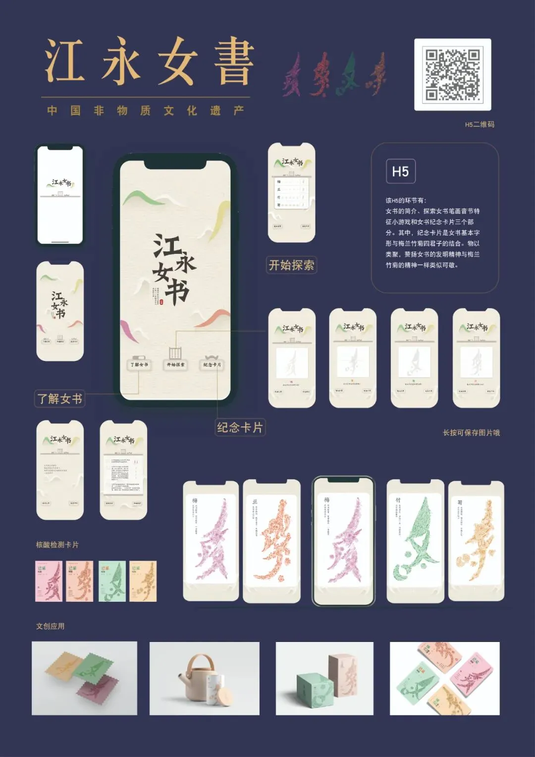 女书作为世界仅存的独一无二的妇女文字,又名江永女书。该信息图表从字体本身与传统文化的关系,开发出“女书桃李艳,花鸟月近人”的字体插画设计,和“梅兰竹菊”女君子的形象结合,共同传播新时代女性的魅力,在并延伸应用于生活中;又从数字化的角度,与H5结合,动态传播了女书文化。