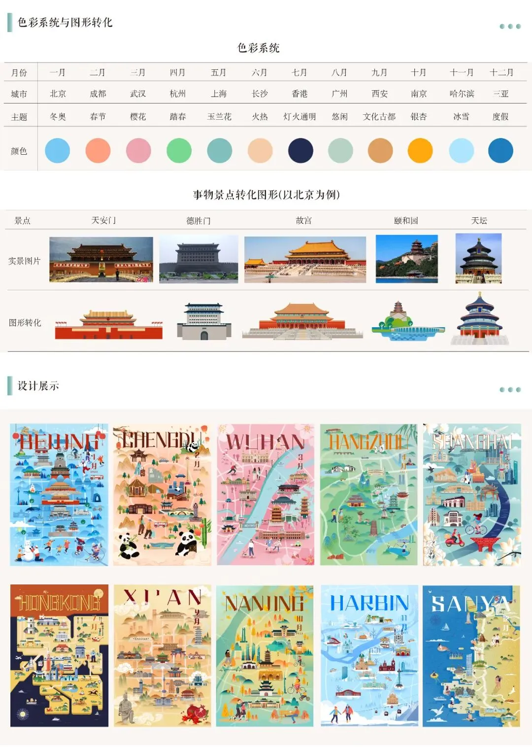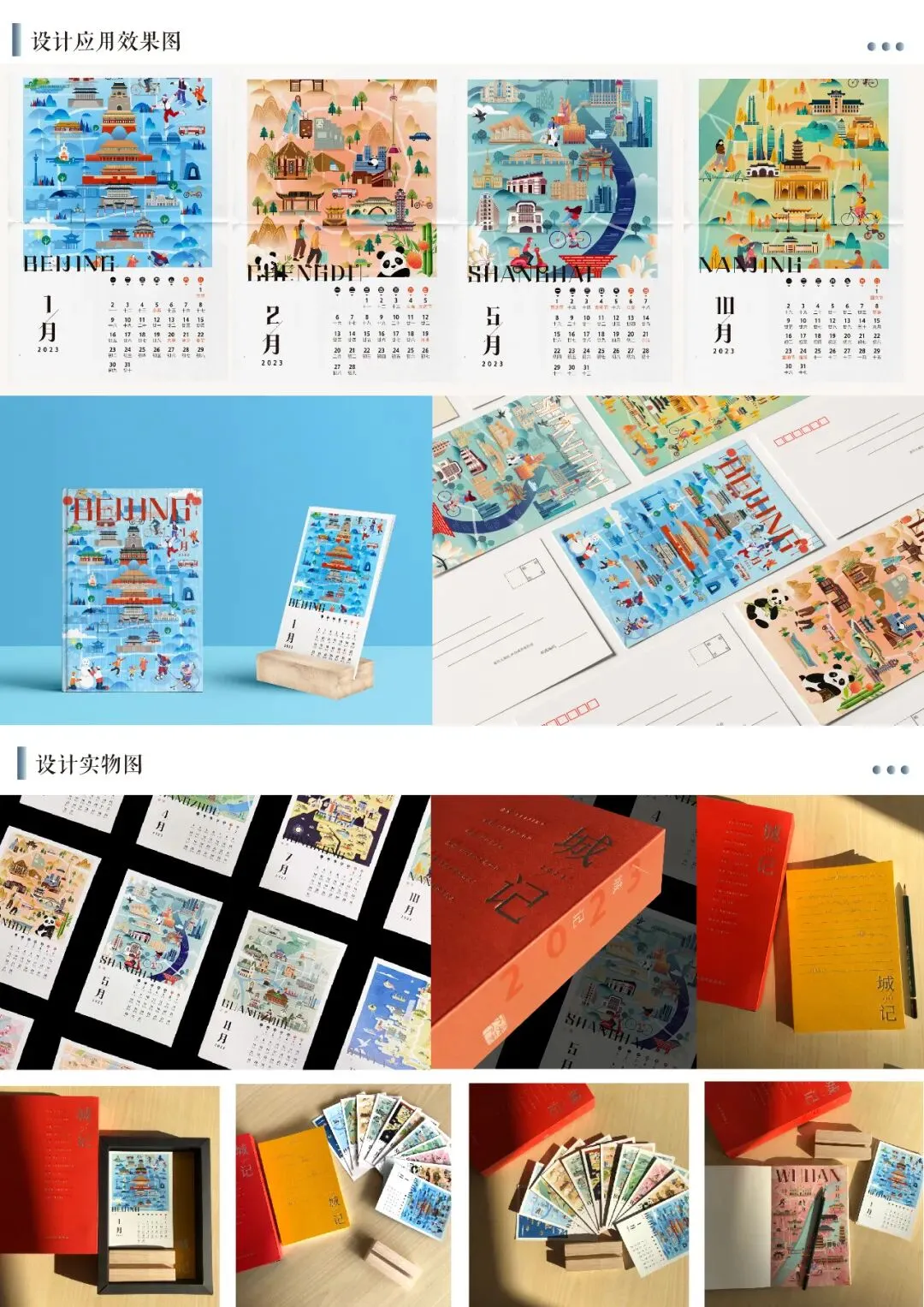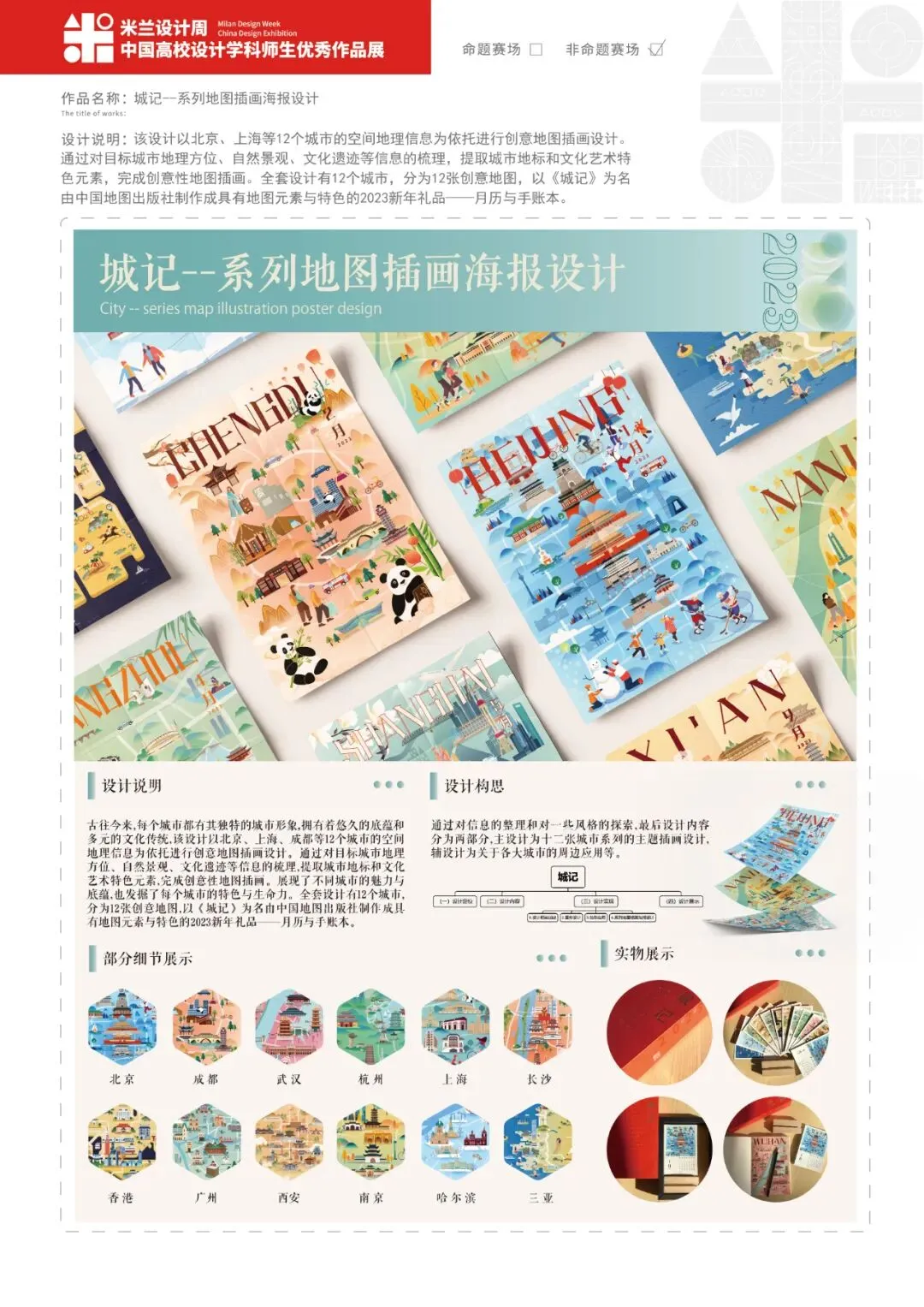 古往今来,每个城市都有其独特的城市形象,拥有着悠久的底蕴和多元的文化传统,该设计以北京、上海、成都等12个城市的空间地理信息为依托进行创意地图插画设计。通过对目标城市地理方位、自然景观、文化遗迹等信息的梳理,提取城市地标和文化艺术特色元素,完成创意性地图插画。展现了不同城市的魅力与底蕴,也发掘了每个城市的特色与生命力。全套设计有12个城市,分为12张创意地图,以《城记》为名由中国地图出版社制作成具有地图元素与特色的2023新年礼品——月历与手账本。