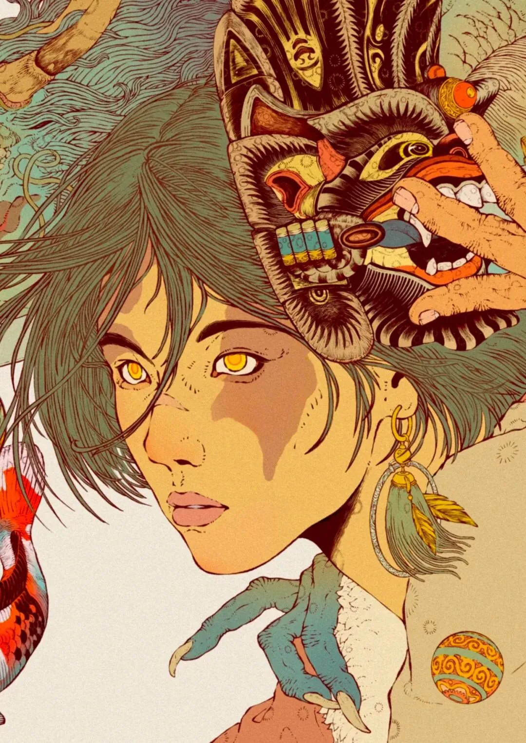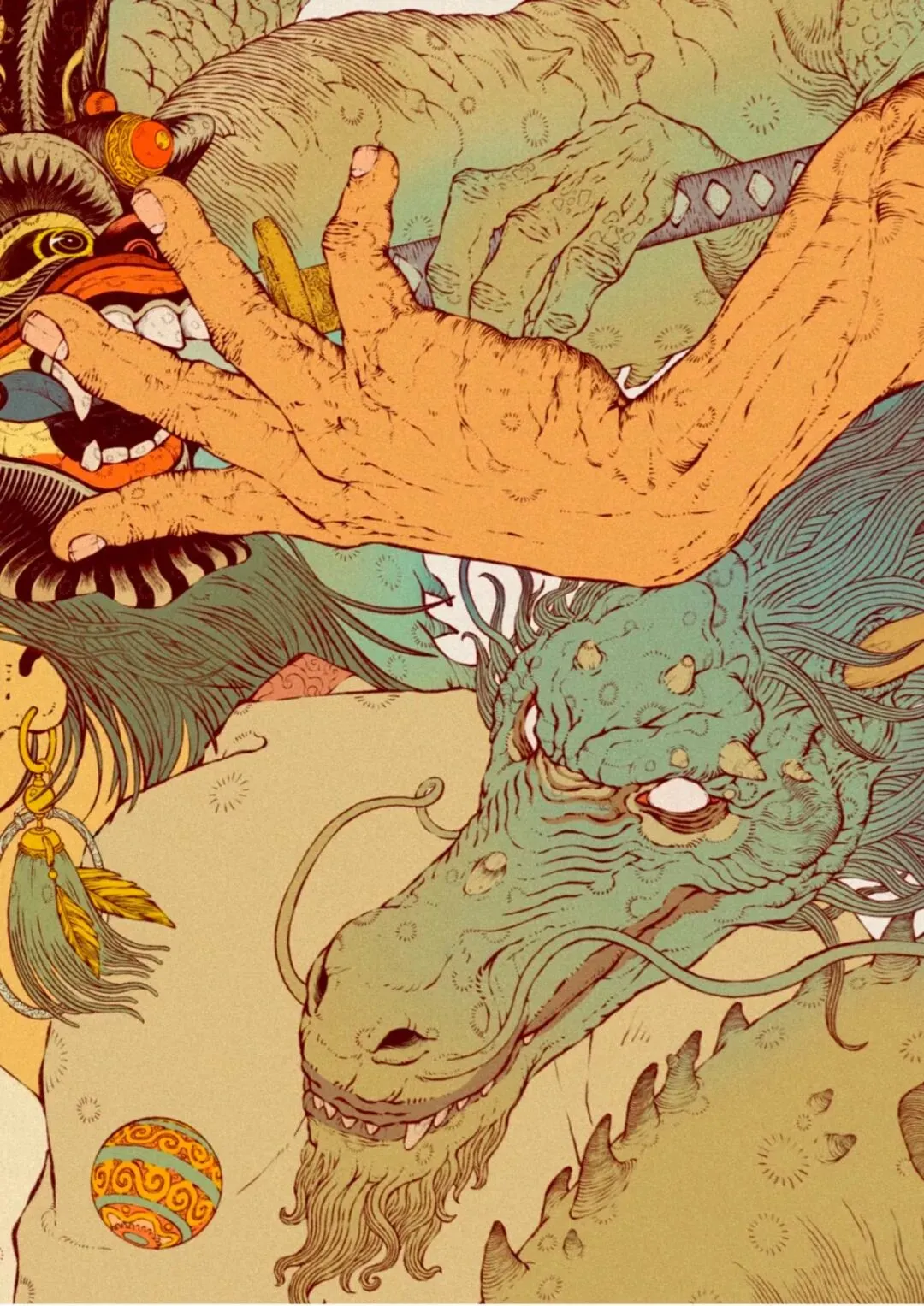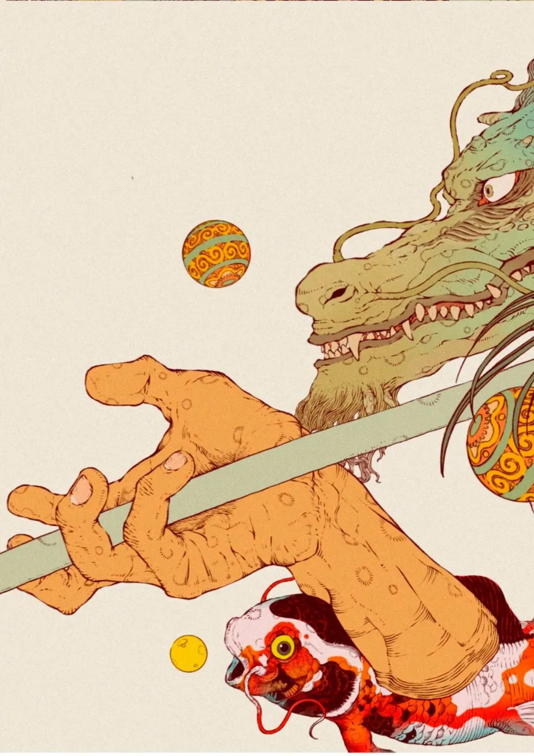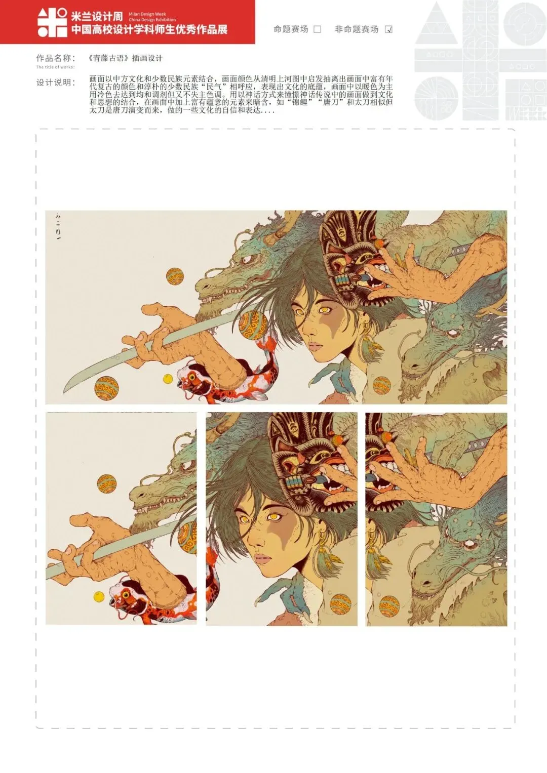 画面以中方文化和少数民族元素结合,画面颜色从清明上河图中启发抽离出画面中富有年代复古的颜色和淳朴的少数民族“民气”相呼应,表现出文化的底蕴,画面中以暖色为主用冷色去达到均和调剂但又不失主色调。用以神话方式来憧憬神话传说中的画面做到文化和思想的结合,在画面中加上富有蕴意的元素来暗含,如“锦鲤”“唐刀”和太刀相似但太刀是唐刀演变而来,做的一些文化的自信和表达....