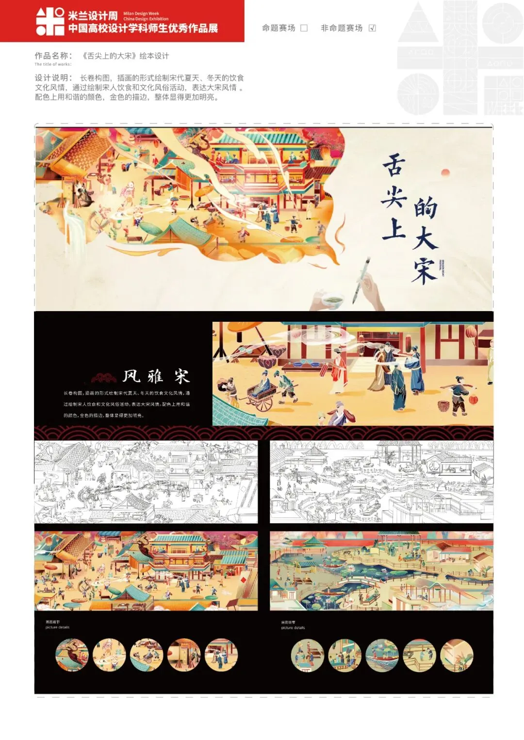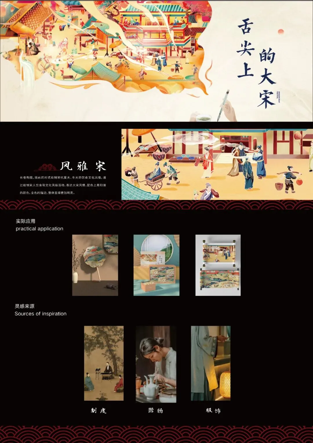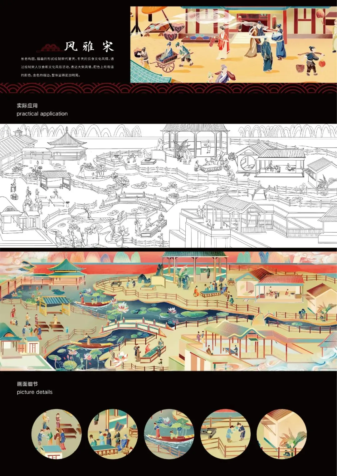 长卷构图,插画的形式绘制宋代夏天、冬天的饮食文化风情,通过绘制宋人饮食和文化风俗活动,表达大宋风情 。配色上用和谐的颜色,金色的描边,整体显得更加明亮。