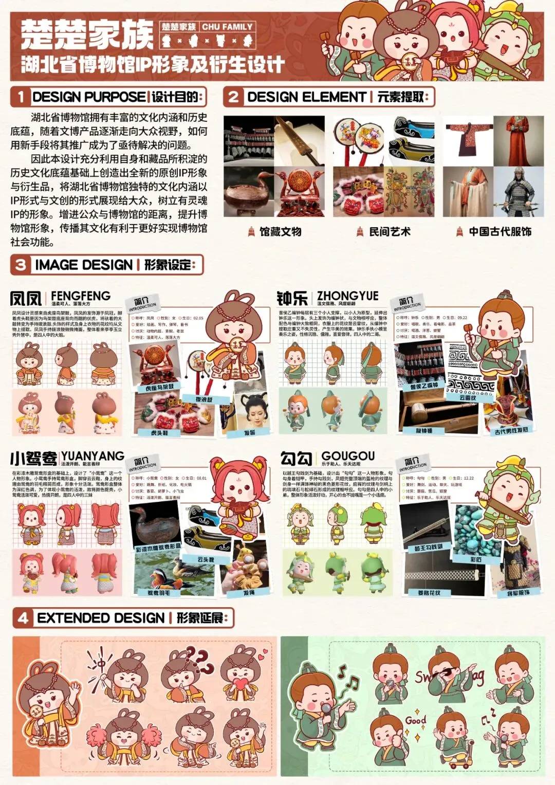 湖北省博物馆拥有丰富的文化内涵和历史底蕴,随着文博产品逐渐走向大众视野,如何用新手段将其推广成为了亟待解决的问题。因此本设计充分利用自身和藏品所积淀的历史文化底蕴基础上创造出全新的原创IP形象与衍生品,将其特的文化内涵以IP形式与文创的形式展现给大众,树立有灵魂IP的形象。增进公众与博物馆的距离,提升博物馆形象,传播其文化有利于更好实现博物馆社会功能。