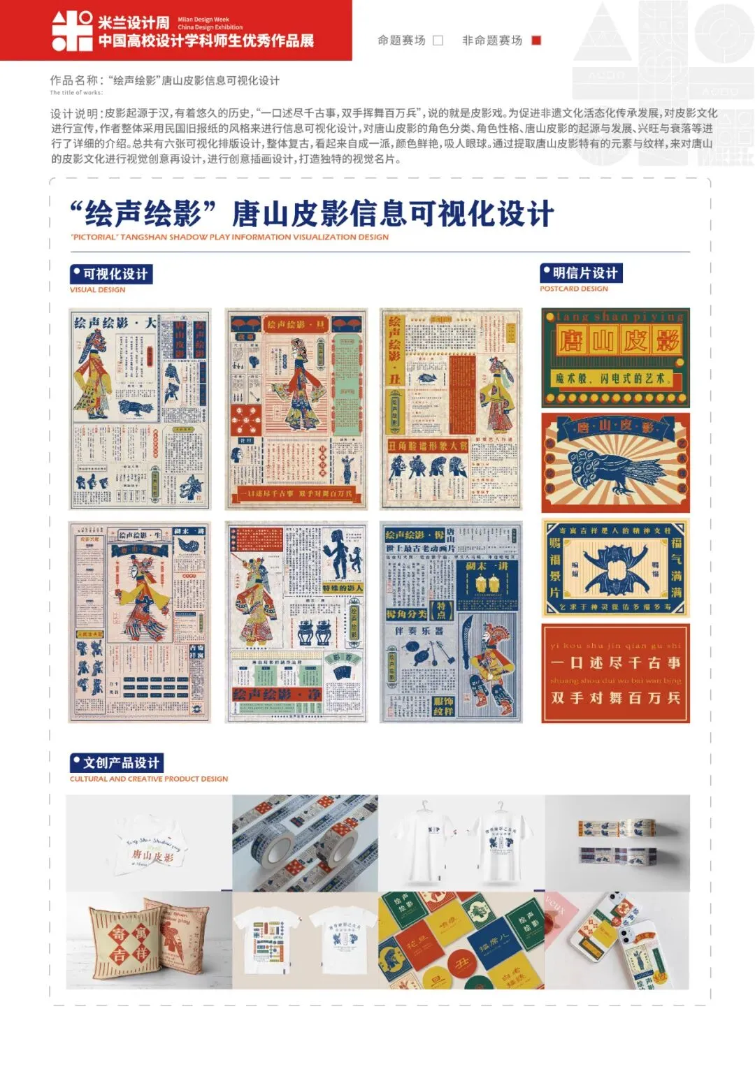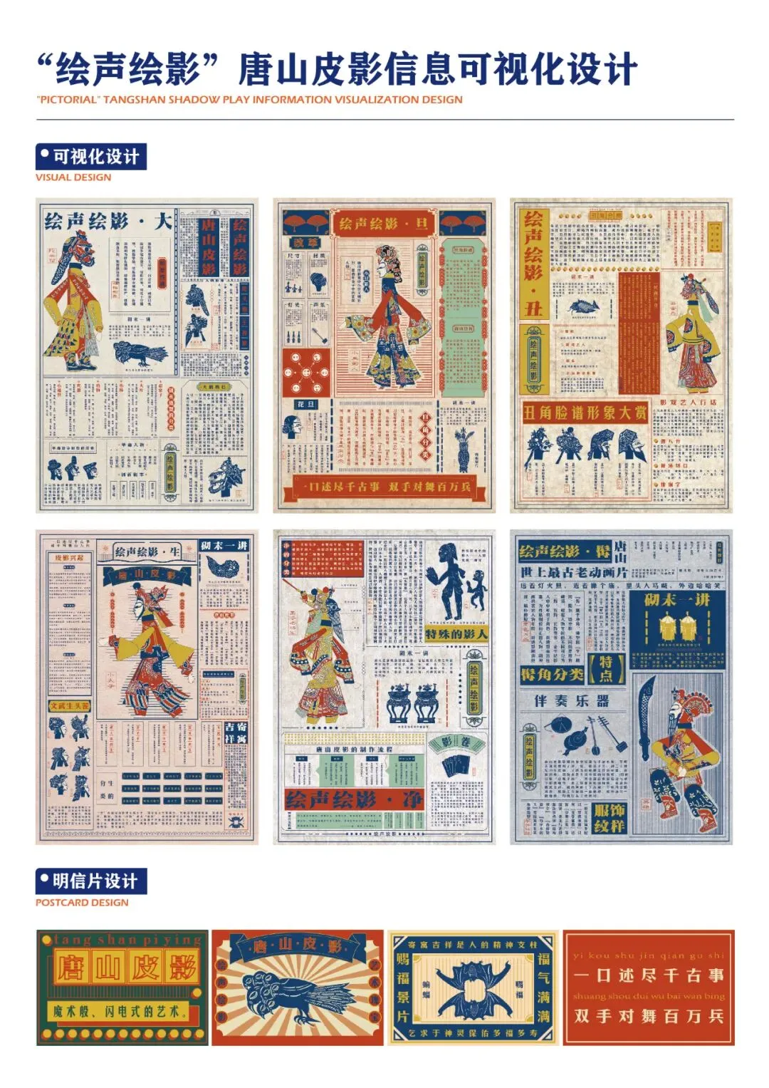 皮影起源于汉,有着悠久的历史,“一口述尽千古事,双手挥舞百万兵”,说的就是皮影戏。为促进非遗文化活态化传承发展,对皮影文化进行宣传,作者整体采用民国旧报纸的风格来进行信息可视化设计,对唐山皮影的角色分类、角色性格、唐山皮影的起源与发展、兴旺与衰落等进行了详细的介绍。总共有六张可视化排版设计,整体复古,看起来自成一派,颜色鲜艳,吸人眼球。通过提取唐山皮影特有的元素与纹样,来对唐山的皮影文化进行视觉创意再设计,进行创意插画设计,打造独特的视觉名片。