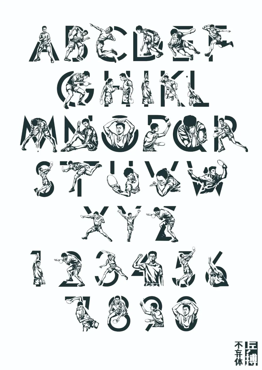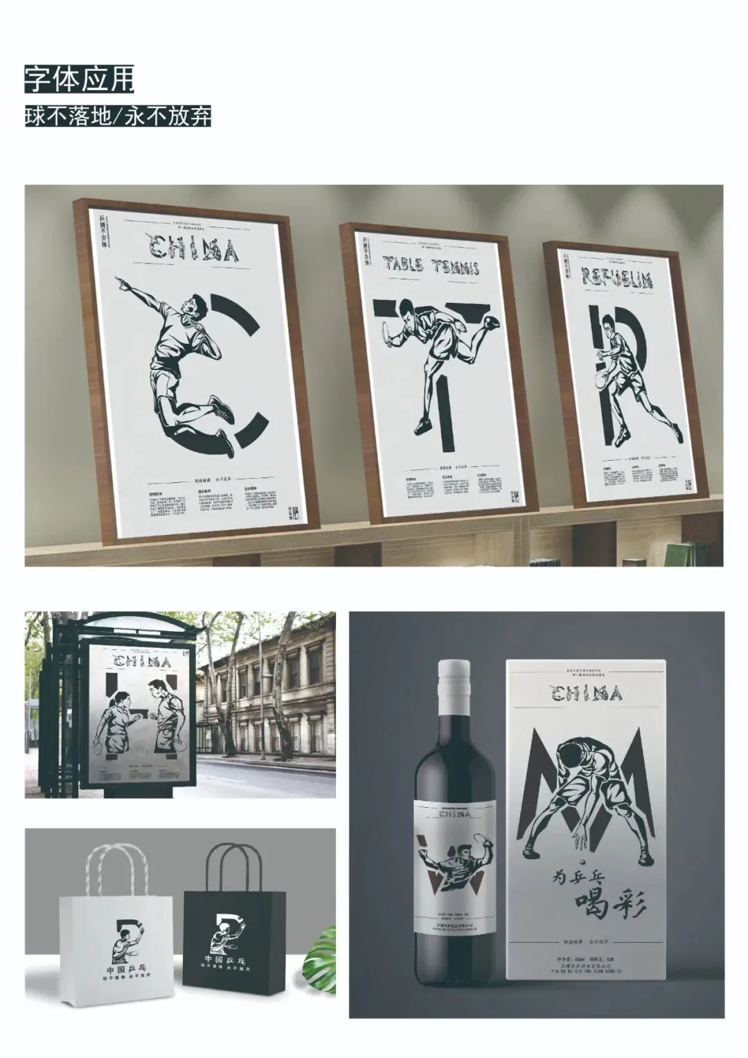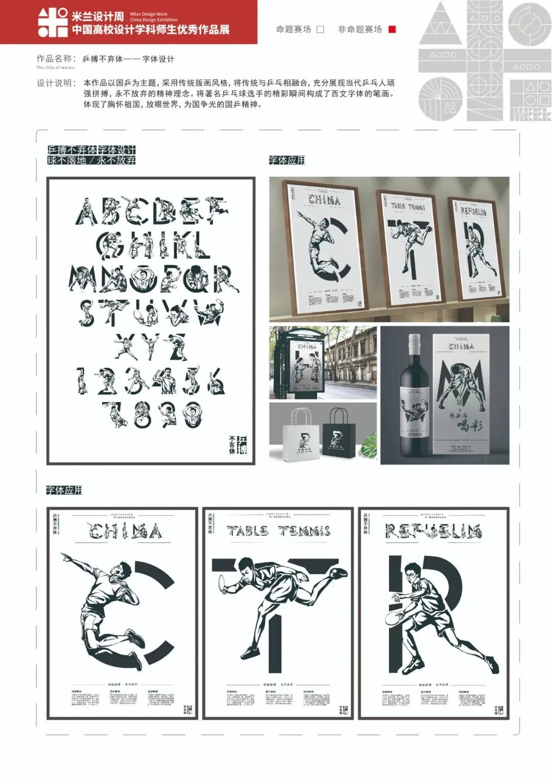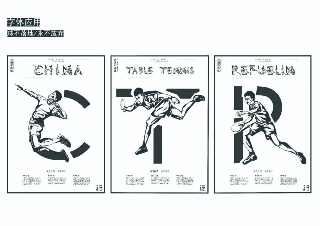 本作品以国乒为主题,采用传统版画风格,将传统与乒乓相融合,充分展现当代乒乓人顽强拼搏,永不放弃的精神理念。将著名乒乓球选手的精彩瞬间构成了西文字体的笔画。体现了胸怀祖国,放眼世界,为国争光的国乒精神。