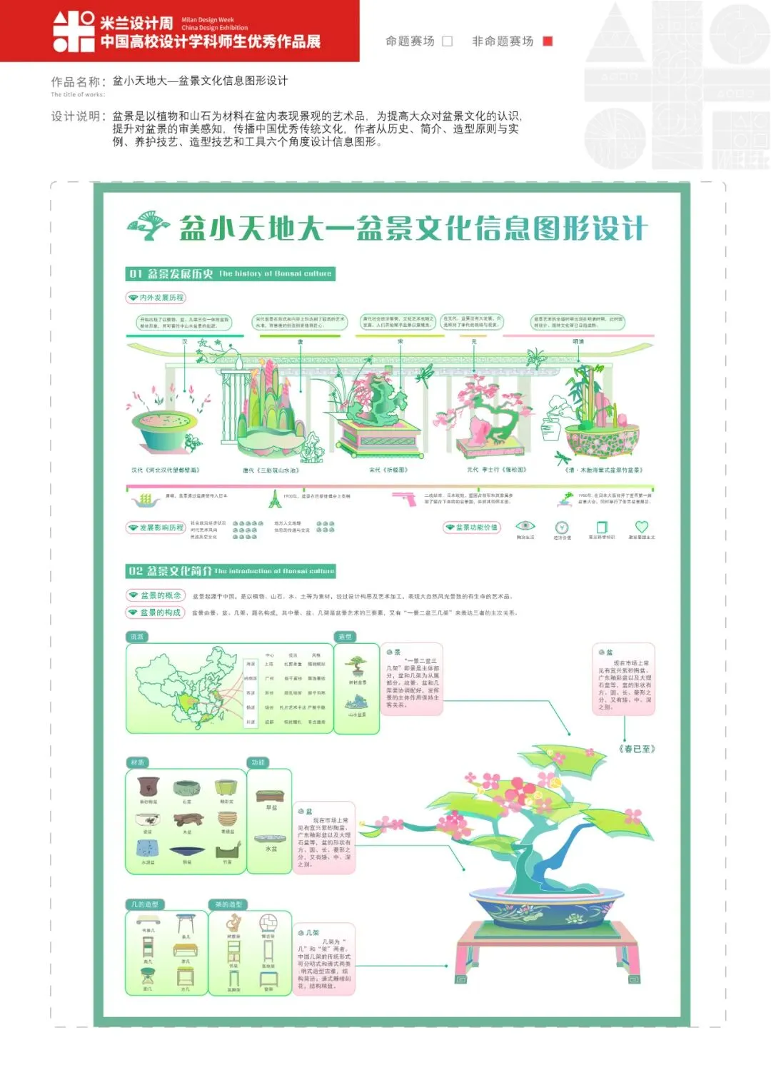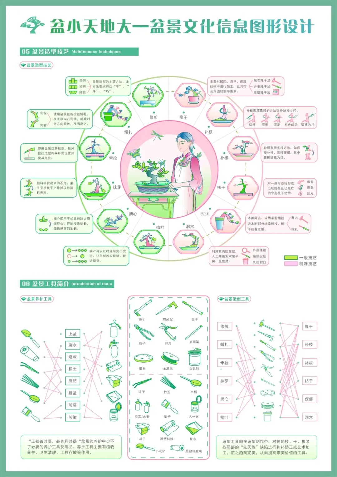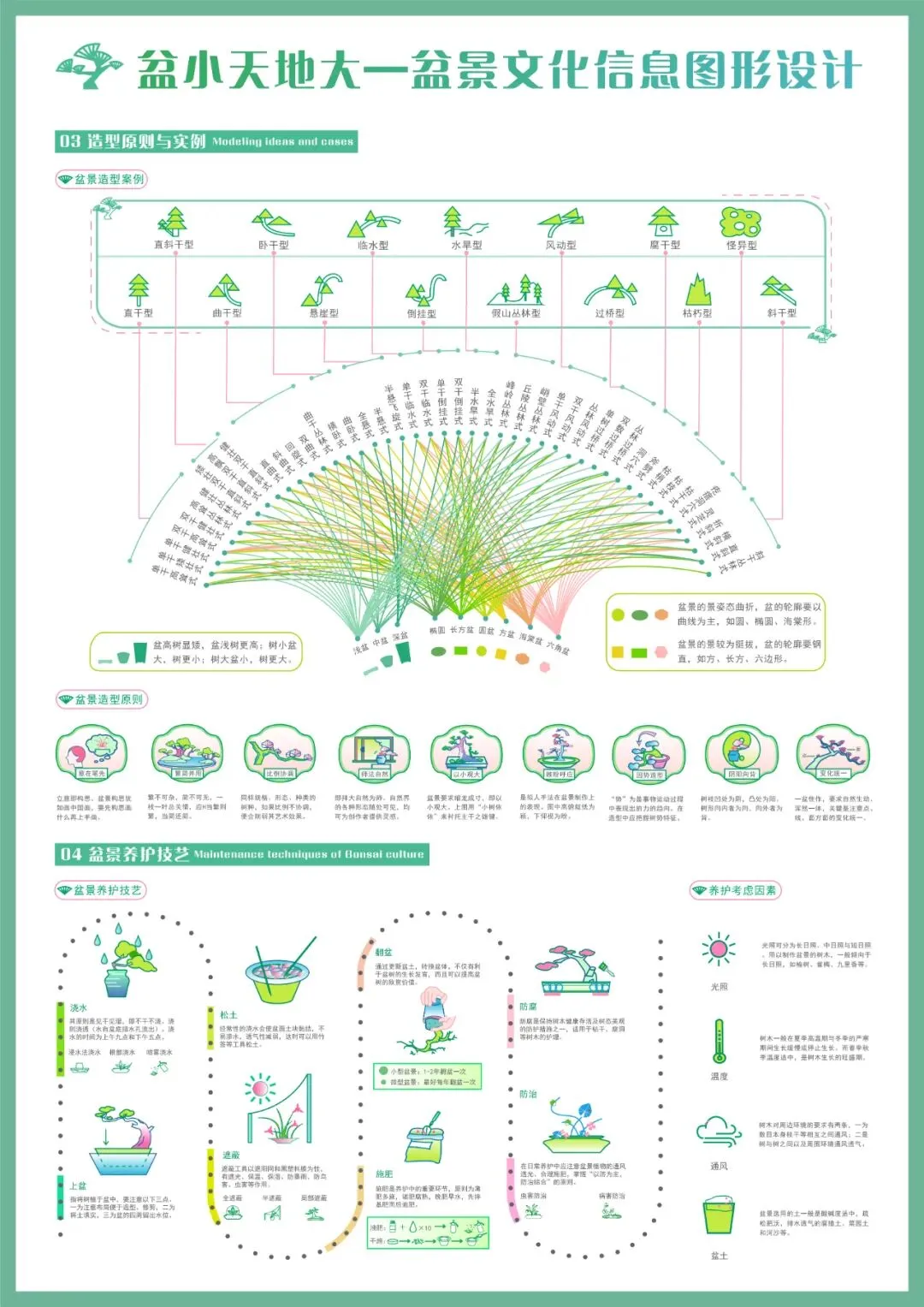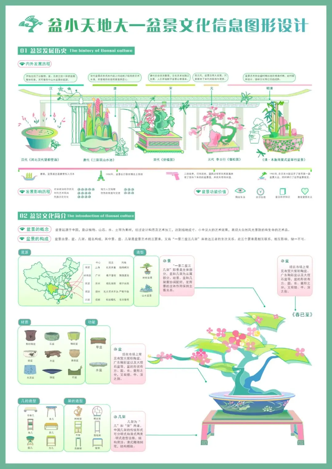 盆景是以植物和山石为材料在盆内表现景观的艺术品,为提高大众对盆景文化的认识,提升对盆景的审美感知,传播中国优秀传统文化,作者从历史、简介、造型原则与实例、养护技艺、造型技艺和工具六个角度设计信息图形。