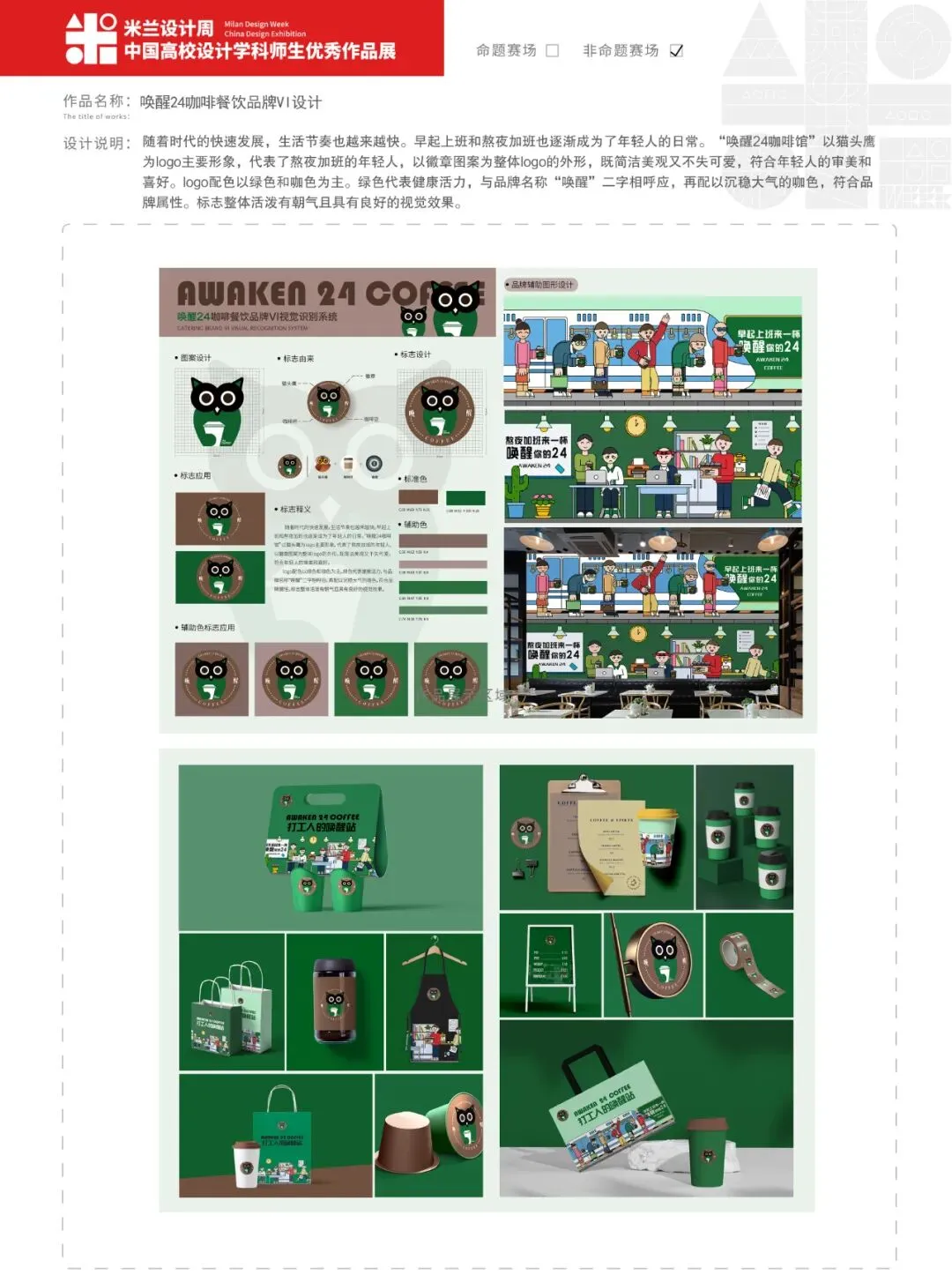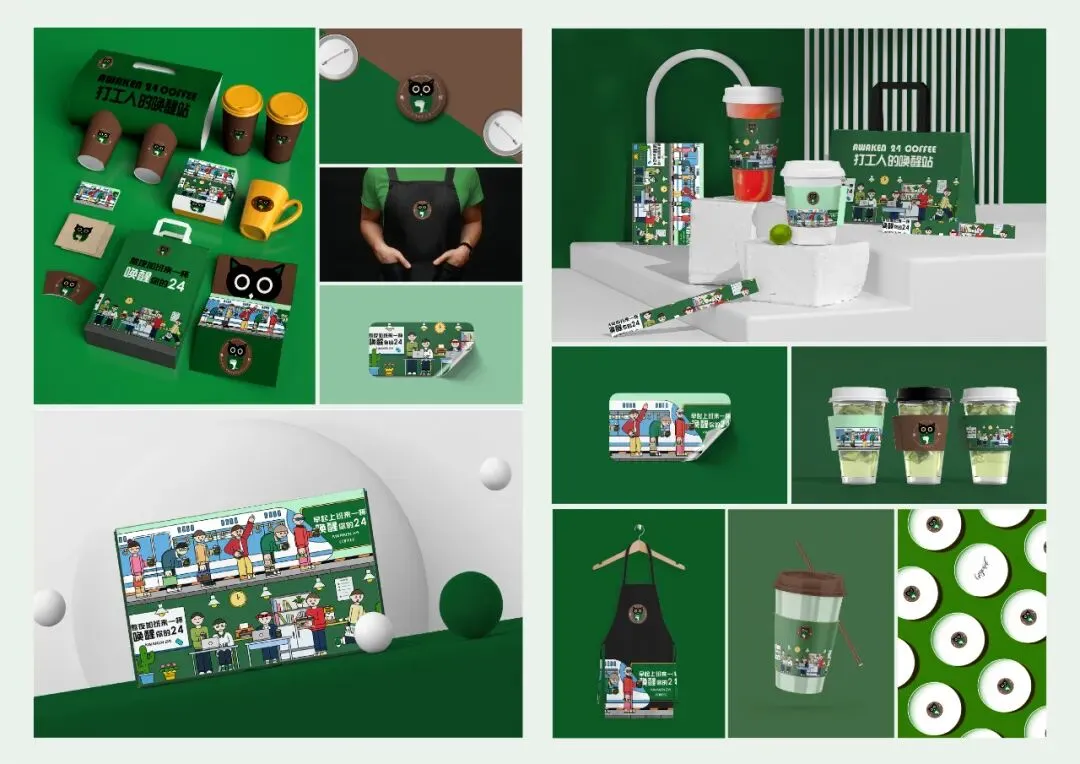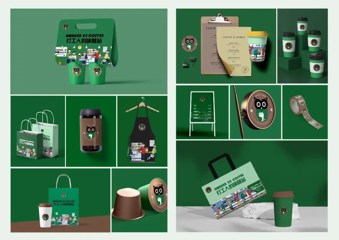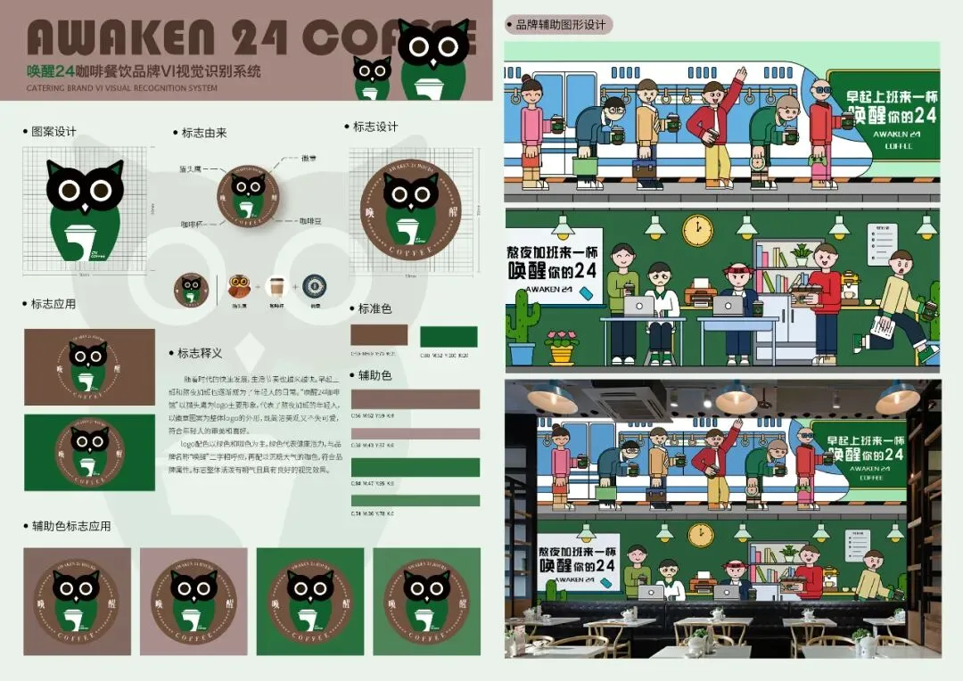 随着时代的快速发展,生活节奏也越来越快。早起上班和熬夜加班也逐渐成为了年轻人的日常。“唤醒24咖啡馆”以猫头鹰为logo主要形象,代表了熬夜加班的年轻人,以徽章图案为整体logo的外形,既简洁美观又不失可爱,符合年轻人的审美和喜好。logo配色以绿色和咖色为主。绿色代表健康活力,与品牌名称“唤醒”二字相呼应,再配以沉稳大气的咖色,符合品牌属性。标志整体活泼有朝气且具有良好的视觉效果。