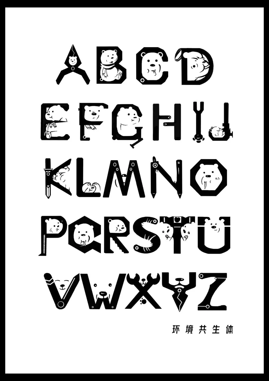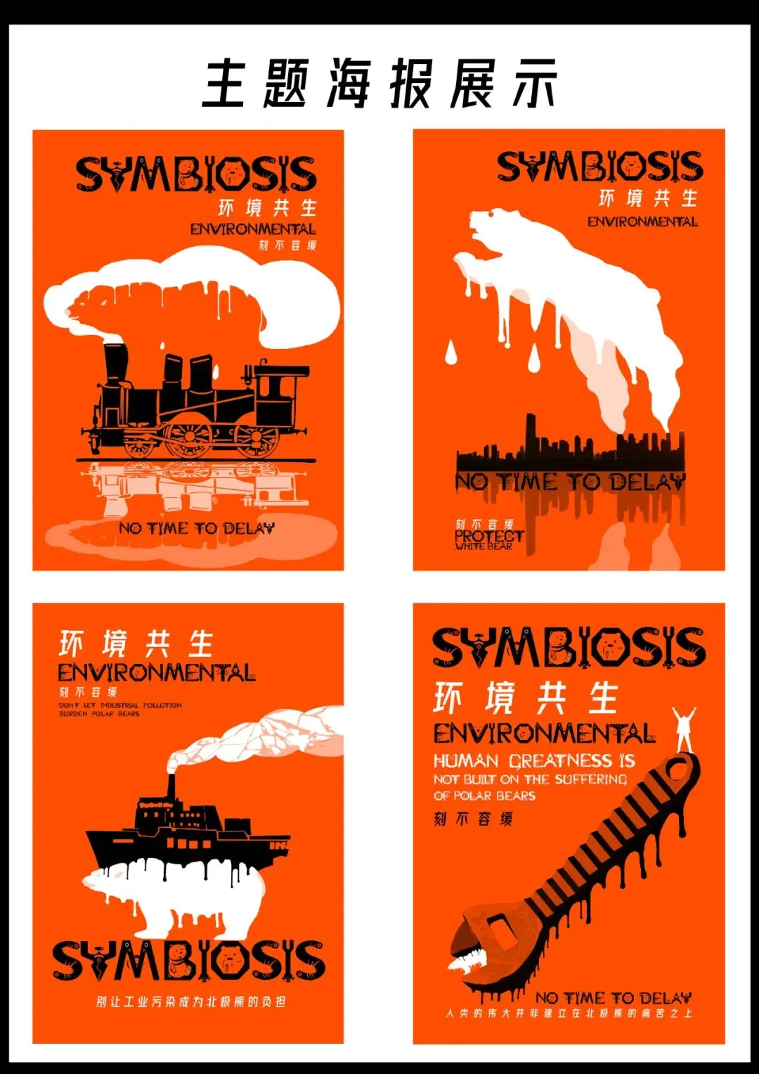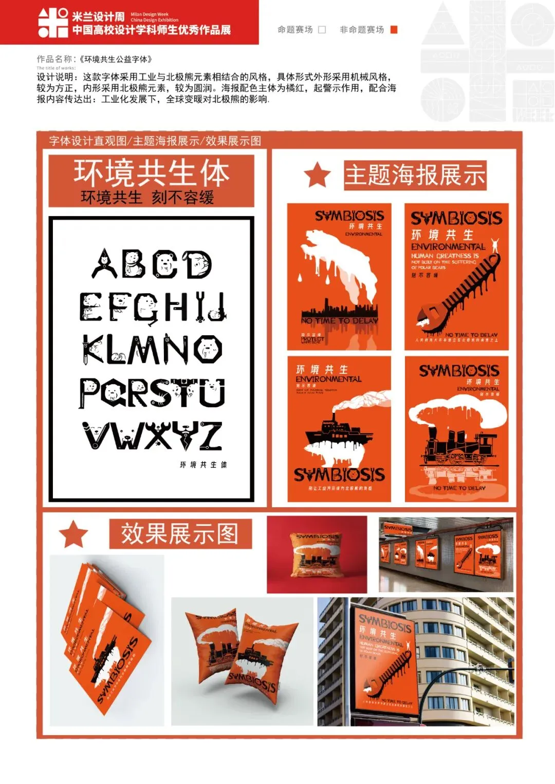 这款字体采用工业与北极熊元素相结合的风格,具体形式外形采用机械风格,较为方正,内形采用北极熊元素,较为圆润。海报配色主体为橘红,起警示作用,配合海报内容传达出:工业化发展下,北极熊的生存环境岌岌可危,人类与北极熊环境共生刻不容缓。