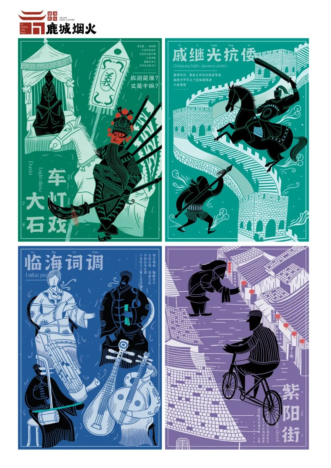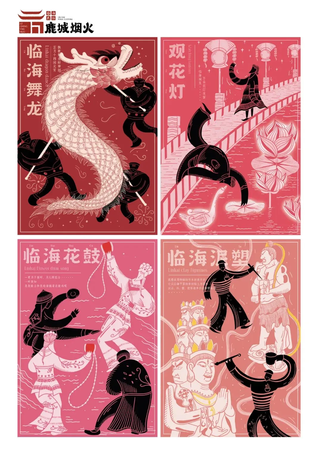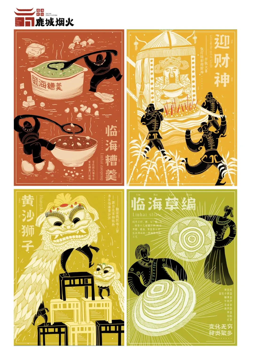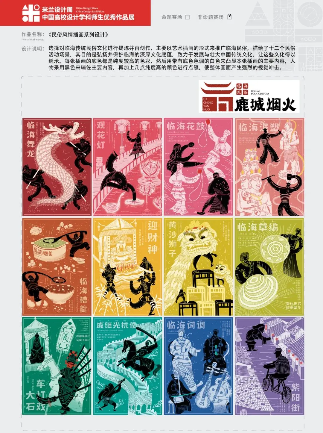 选择对临海传统民俗文化进行提炼并再创作,主要以艺术插画的形式来推广临海民俗,描绘了十二个民俗活动场景,其目的是弘扬并保护临海的深厚文化底蕴,致力于发展与壮大中国传统文化,让这些文化得以继承。每张插画的底色都是纯度较高的色彩,然后用带有底色色调的白色来凸显本张插画的主要内容,人物采用黑色来辅佐主要内容,再加上几点纯度高的颜色进行点缀,使整体画面产生强烈的视觉冲击。