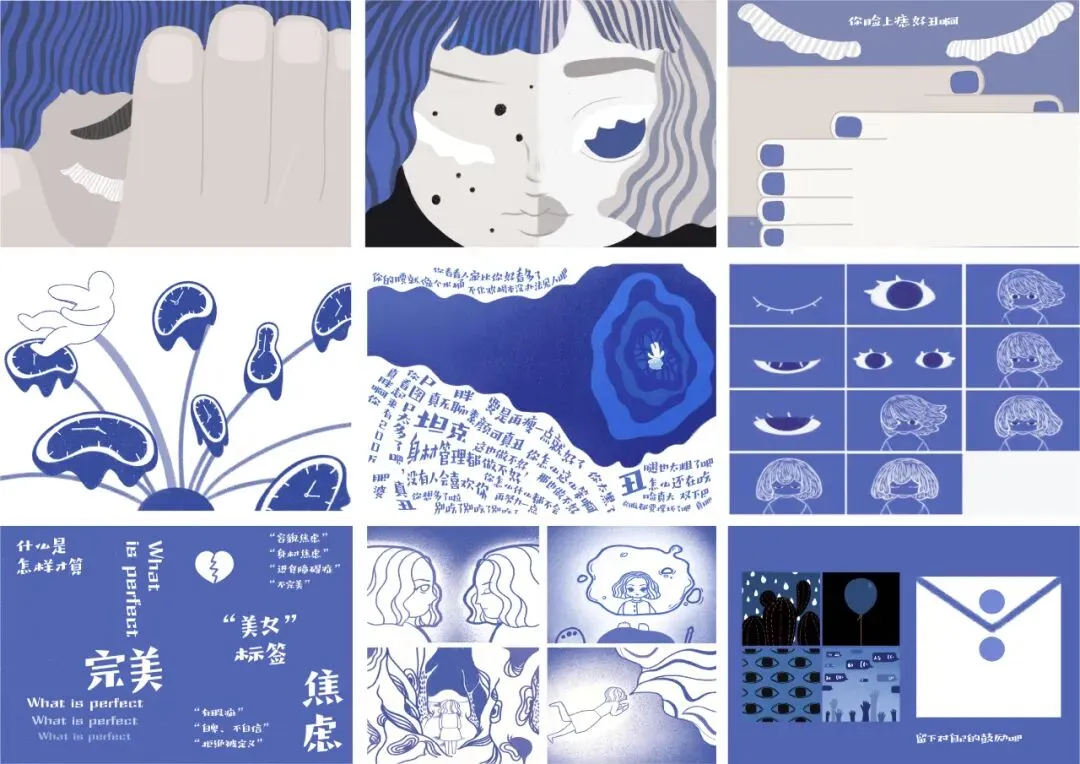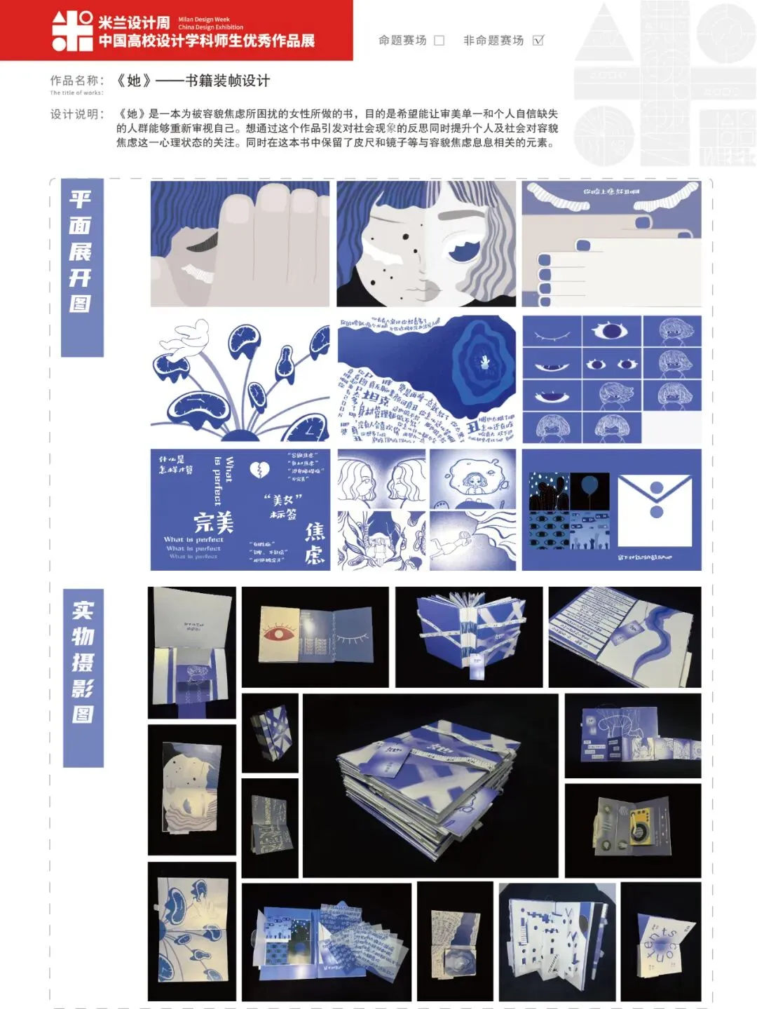 《她》是一本为被容貌焦虑所困扰的女性所做的书,目的是希望能让审美单一和个人自信缺失的人群能够重新审视自己。想通过这个作品引发对社会现象的反思同时提升个人及社会对容貌焦虑这一心理状态的关注。同时在这本书中保留了皮尺和镜子等与容貌焦虑息息相关的元素。(PS:本文封面源于《花花草草·种子包装设计》,作者:毕珂宁,版权归原作者所有。作品展示仅供学术交流分享,如涉及版权问题,请及时联系我们。更多赛事信息可关注微信公众号:米兰设计周高校设计展