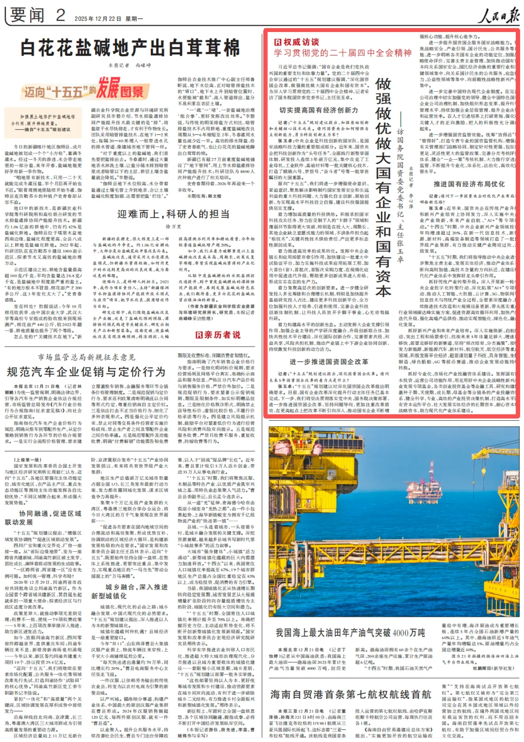 12月22日,《人民日报》要闻版刊发国务院国资委党委书记、主任张玉卓专访《做强做优做大国有企业和国有资本(权威访谈·学习贯彻党的二十届四中全会精神)》。我们为您全文分享如下——
