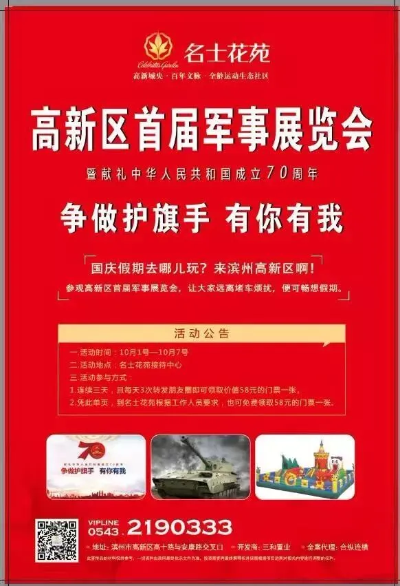 为献礼国庆,名士花苑特于国庆假期即将来临之际,联合山东省互联网传媒集团、滨州市文明办、滨州大众网举办“高新区首届军事展览会暨献礼中华人民共和国成立70周年——争做护旗手 有你有我”大型活动,让大家“梦启名士·与国同庆”不必远游,便可畅玩。