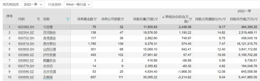 小柒查询了2021年营收排名靠前的10家上市酒企被基金增减持的情况,发现有6家被增持,分别是今世缘、洋河股份、舍得酒业、贵州茅台、山西汾酒、泸州老窖;
