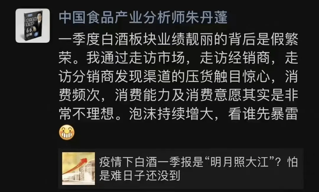 一季报业绩公布后,就有产业分析师质疑靓丽业绩的背后是虚假繁荣,他走访市场、走访经销商、分销商后发现,渠道的压货触目惊心,消费频次、消费能力和消费意愿非常不理想。泡沫越吹越大,就看谁先爆雷。