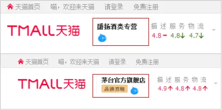 绝大多数知名白酒品牌的天猫、京东官方旗舰店都属于品牌官方自营,产品质量、服务和物流耗时与官方商城差不多。不过,较之于官方商城,这一类官方旗舰店会有更多的促销活动,“双十一”、“618”以及年节期间往往会推出重大的节庆促销优惠。需要注意的是,很多经销商也会选择开设京东/淘宝店,故需要分清官方旗舰店与经销商网店的区别。官方旗舰店带有品牌直销的认证标志,如下图。03
