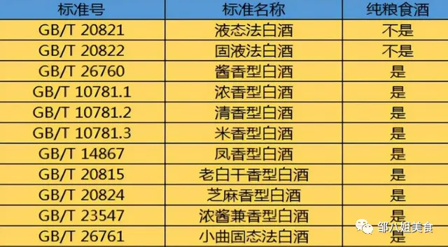 固态法白酒就是常说的纯粮酒,酿造过程中只是用粮食和水,不会再加入其它物质。但是纯粮酒香型众多,所以每个香型的白酒它们的执行标准号都不相同,如果不知道的可以参考下图: