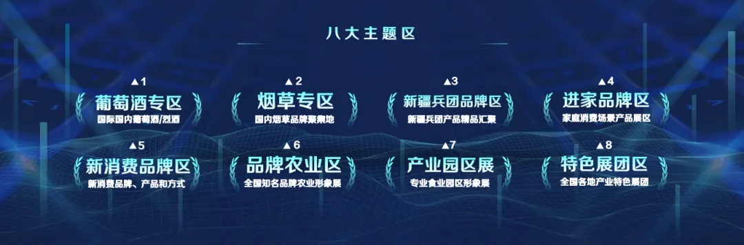 2021届万商大会规划酒类、食品、饮品/乳品、食材、调味品、河南品牌农业六大展,设置葡萄酒、烟草、进家、新消费、产业园、新疆兵团、各地展团、区域农业等八个主题区。