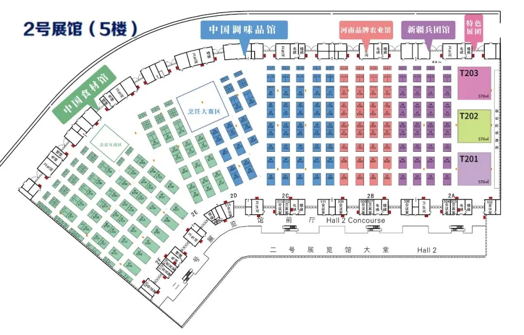2号展馆(5楼)中国食材馆、中国味道馆、产业园区展示区、河南品牌农业馆、各地展团展示专区。