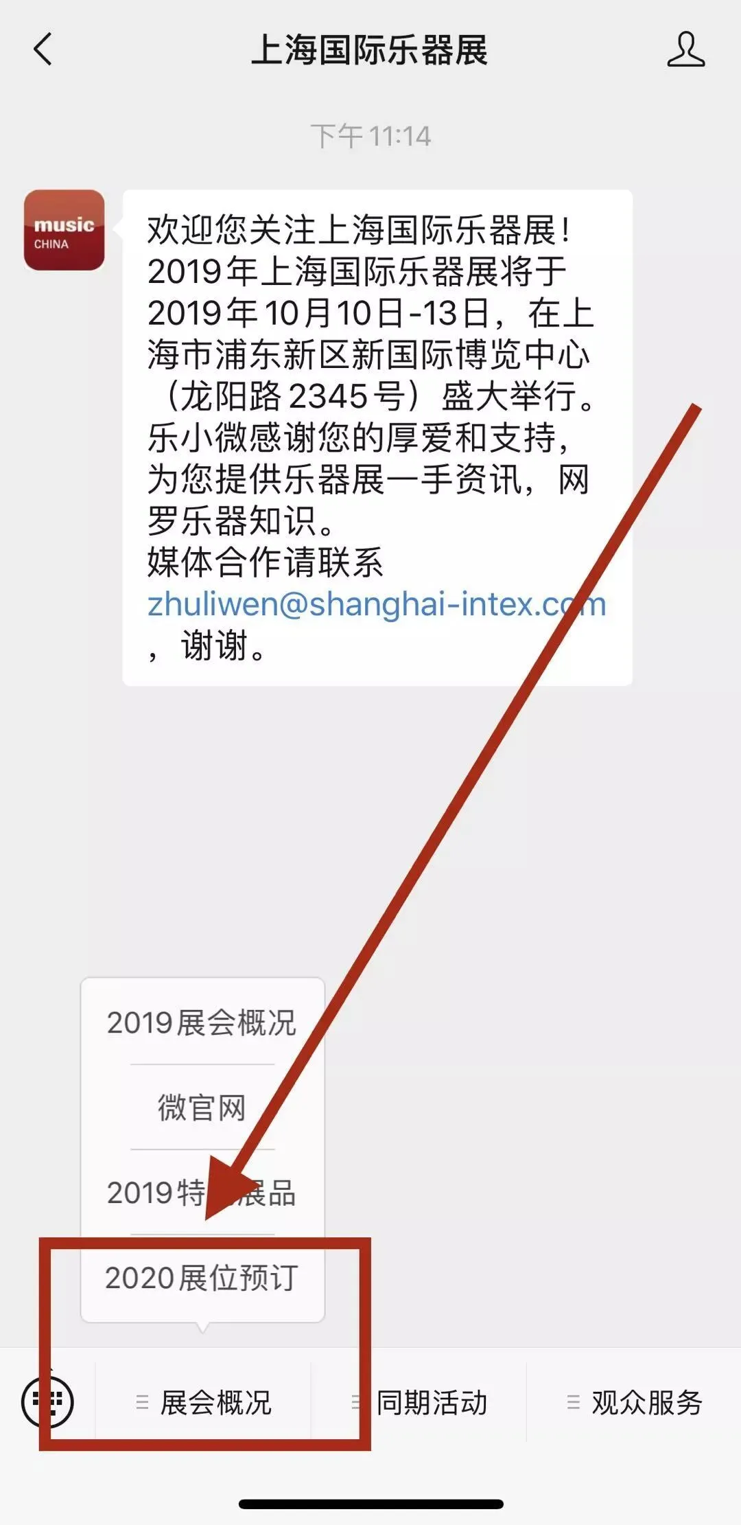 ![]() | 点击微信公众号“上海国际乐器展”,首页菜单“展会概况”→“2020展位预订”,即可在线填写预定表哦~ ←点开查看大图 |