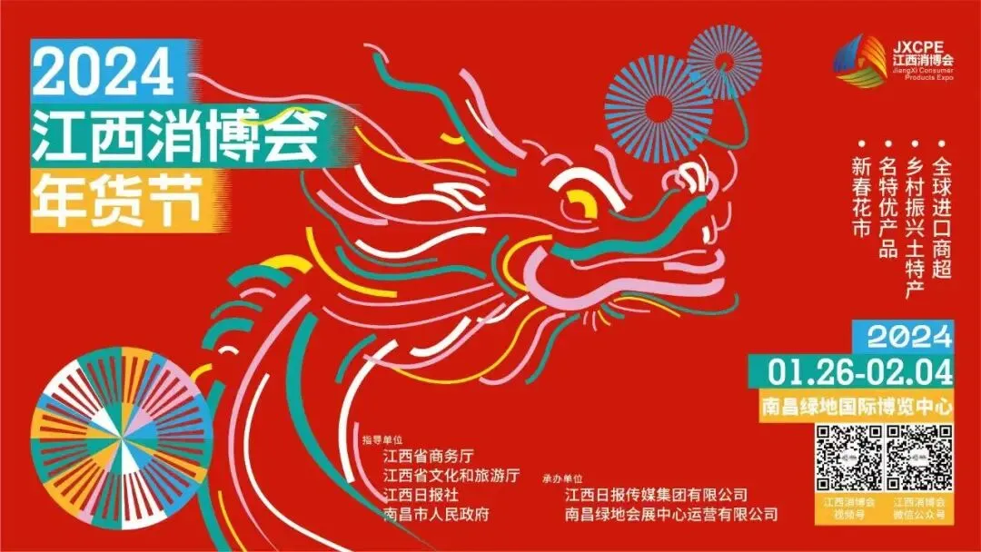 由江西省商务厅、江西省文旅厅、江西日报社、南昌市人民政府指导,江西日报传媒集团有限公司、南昌绿地会展运营有限公司承办的2024江西消博会年货节定档2024年1月26日至2月4日。