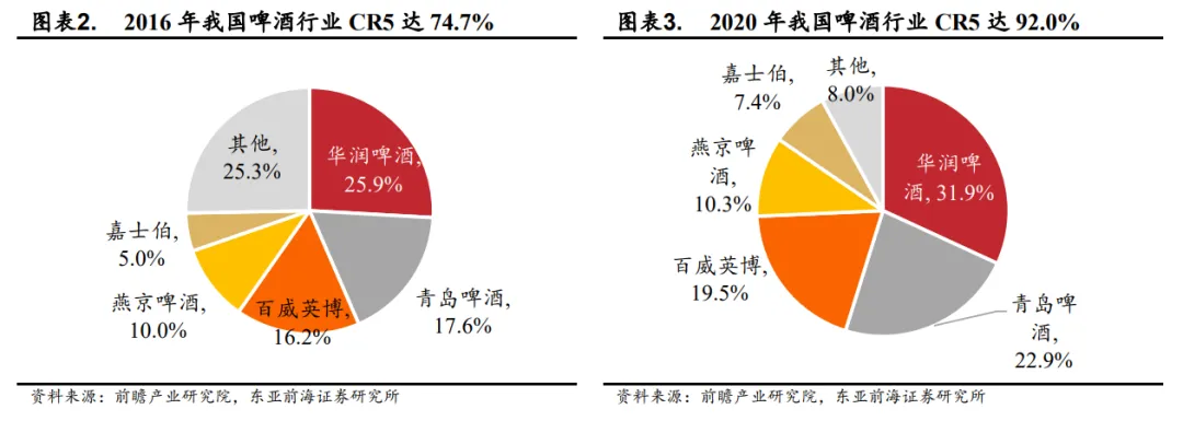 除此之外,啤酒行业已经经过多年内卷,行业集中度大幅提高,2020年全行业92%的市场份额被前五巨头瓜分,分别是华润、青岛、百威、燕京、嘉士伯?