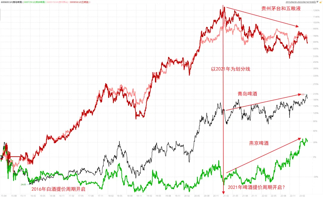 请大家再仔细看?图,这分别是贵州茅台、五粮液、青岛啤酒和燕京啤酒的股价走势图。刚才佐罗在视频里也提到,本轮白酒提价周期是从2016年开始,2021年见顶的,刚好对应着茅台与五粮液的底部和顶部。