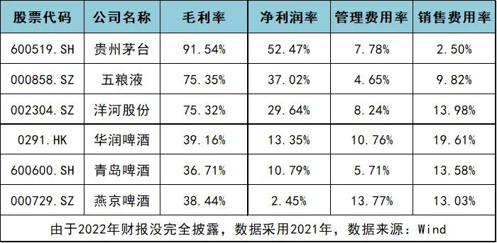 ?图我分别找了三家白酒公司和三家啤酒公司的财务数据进行对比,而且我还额外添加了管理费用率和销售费用率。其中销售费用率是最明显突出高端白酒的品牌价值,品牌价值/知名度越高,就越不需要花钱投广告。