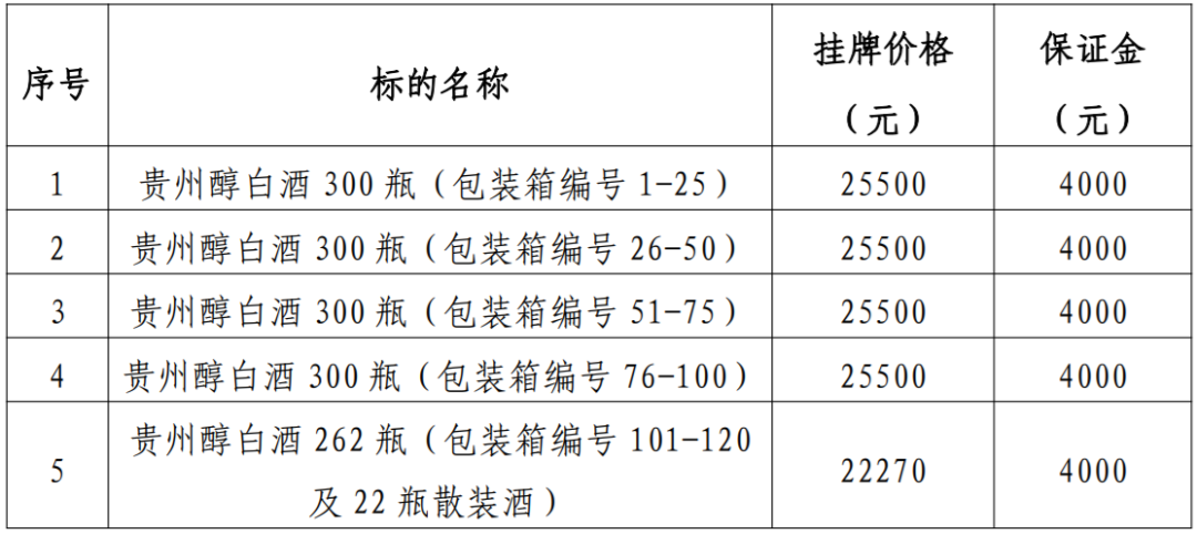 1、交易标的为贵州醇白酒一批,根据现场实际勘察共1462瓶(标的有外包装箱封存,每箱可装12支贵州醇白酒;标的评估单价为人民币85元/瓶;500ml/瓶;酒精度35%vol);分组详见标的明细表。现存放于广州市南沙区,信息详情可到广州产权交易所有限公司现场查阅广州市华盟价格事务所有限公司《关于贵州醇白酒一批价格评估报告书》(穗华价估[2023]041号)。